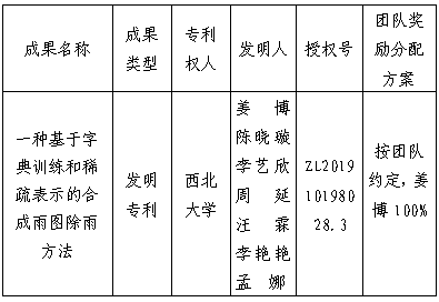 按照《西北大学促进科技成果转化实施办法》(西大科〔2019〕5号)相关规定,拟对我校信息科学与技术学院姜博教授作为成果负责人的1项发明专利权实施转化,现将相关信息公示如下: