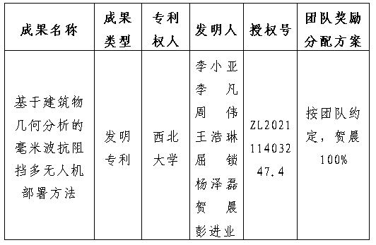 按照《西北大学促进科技成果转化实施办法》(西大科〔2019〕5号)相关规定,拟对我校电子信息学院贺晨教授作为成果负责人的1项发明专利权实施转化,现将相关信息公示如下: