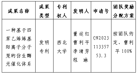 按照《西北大学促进科技成果转化实施办法》(西大科〔2019〕5号)相关规定,拟对我校化学与材料科学学院曹利平教授作为成果负责人的1项发明专利申请权实施转化,现将相关信息公示如下: