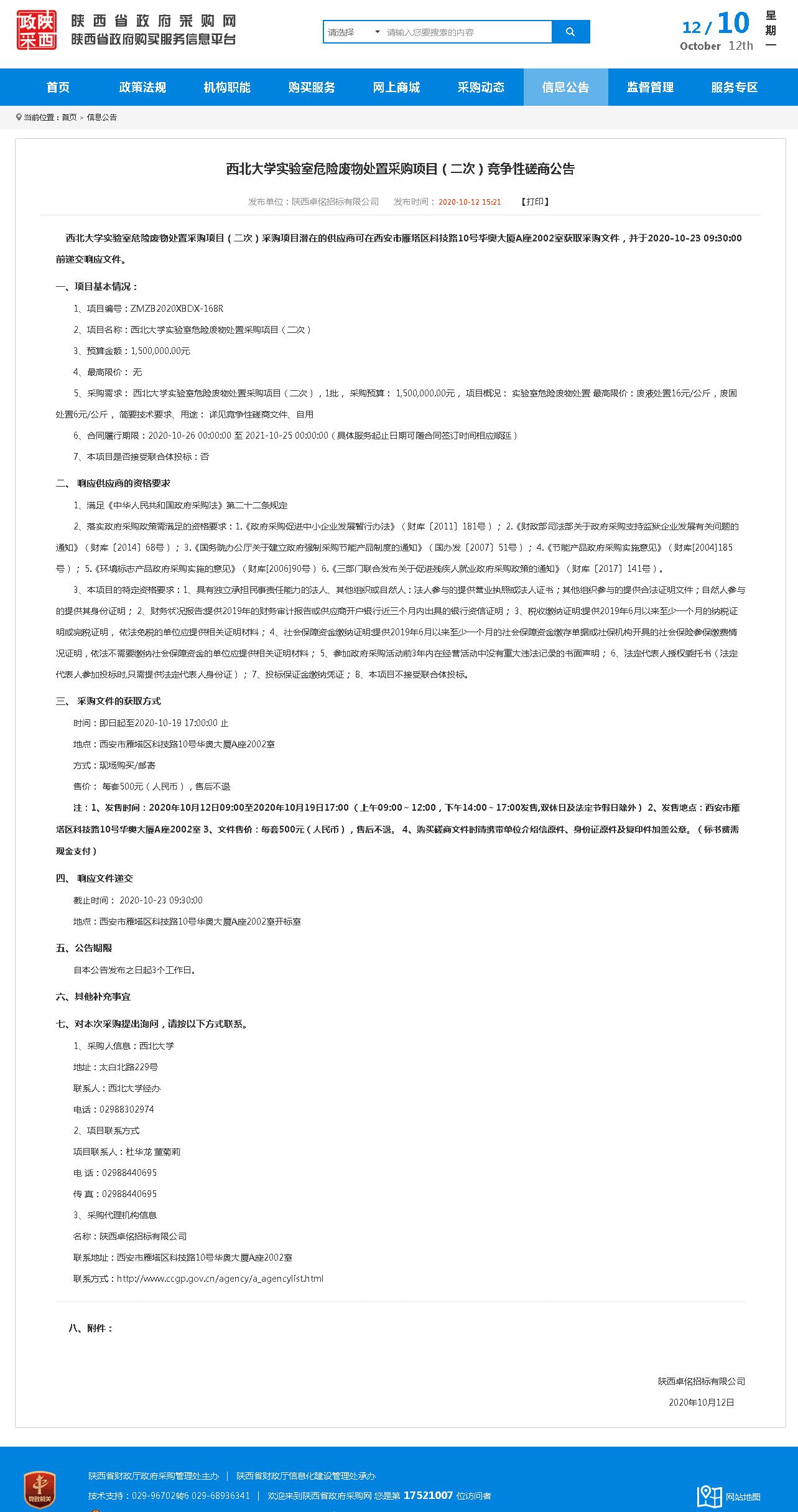 西北大学实验室危险废物处置采购项目(二次)竞争性磋商公告