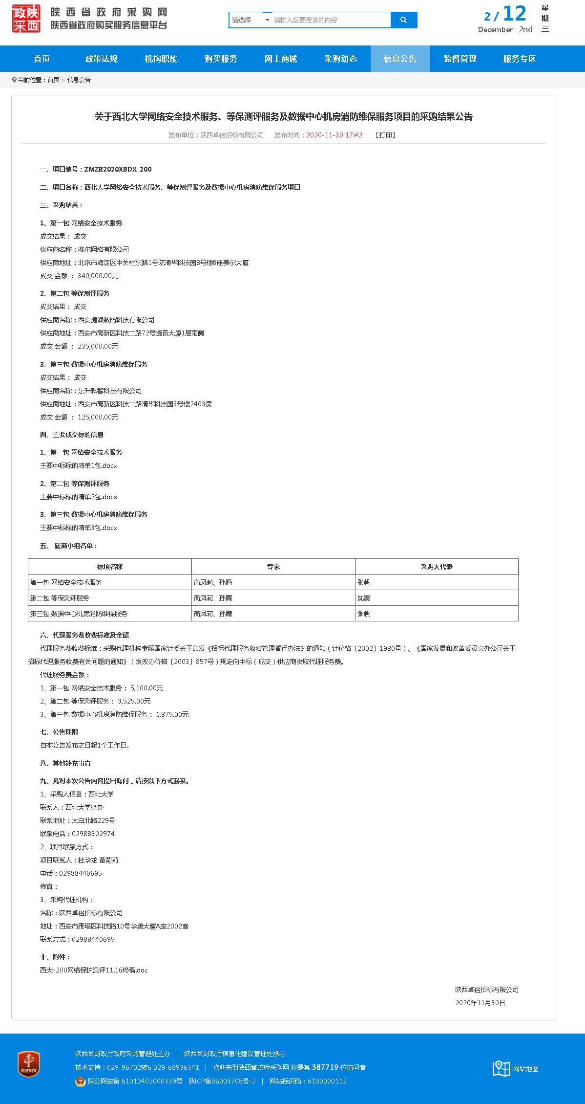 西北大学网络安全技术服务、等保测评服务及数据中心机房消防维保服务项目的采购结果公告