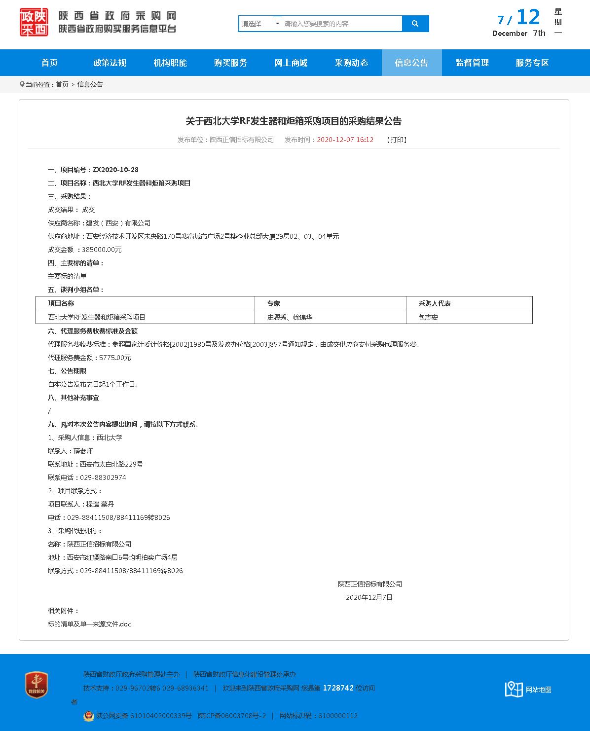 西北大学RF发生器和炬箱采购项目的采购结果公告