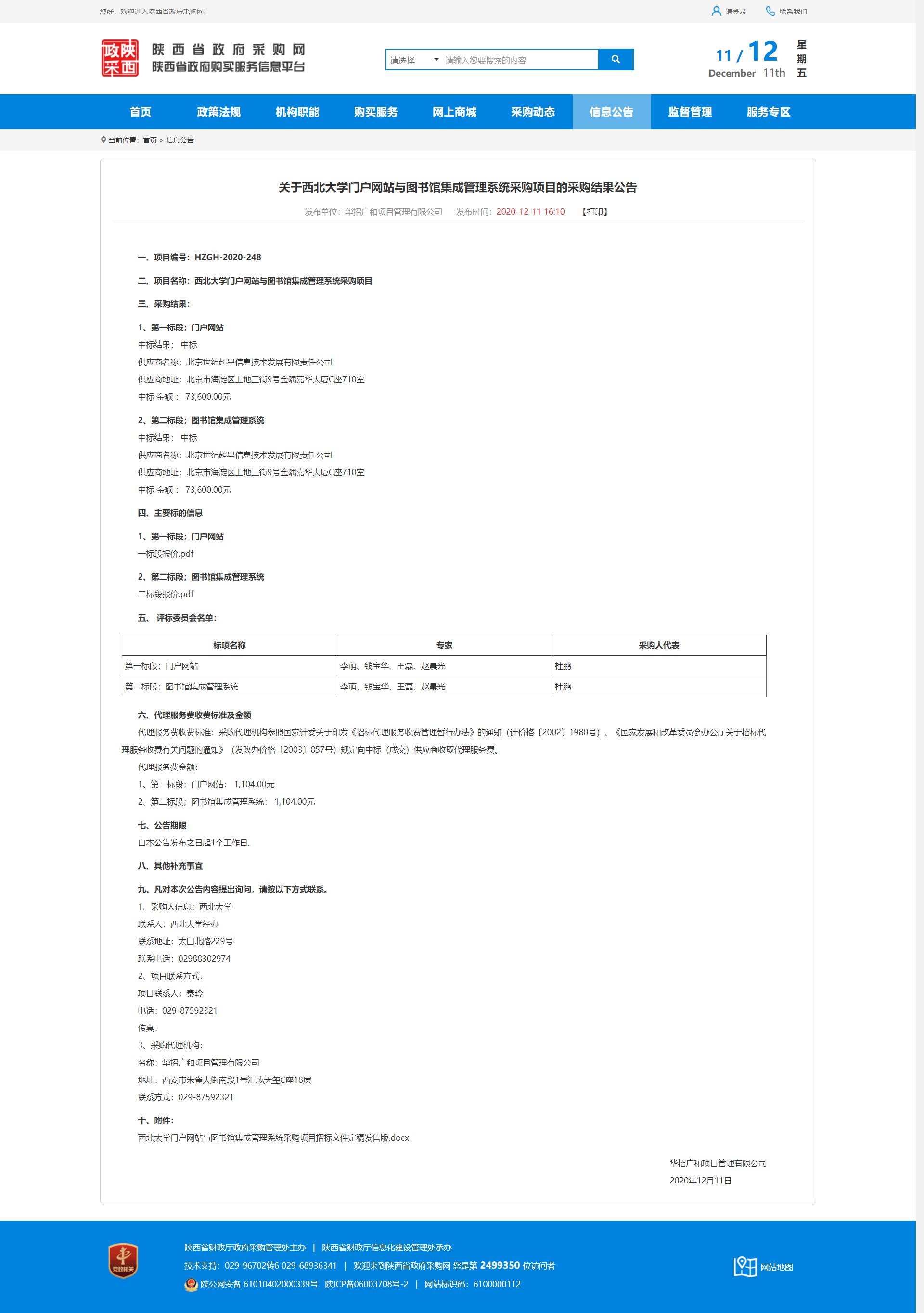 关于西北大学门户网站与图书馆集成管理系统采购项目的采购结果公告 作者: 编辑:薛利娟 时间:2020-12-11 原公告地址:http://www.ccgp-shaanxi.gov.cn/notice/noticeDetail.do?noticeguid=8a85be3275d5d5c2017650d7c2df14aa