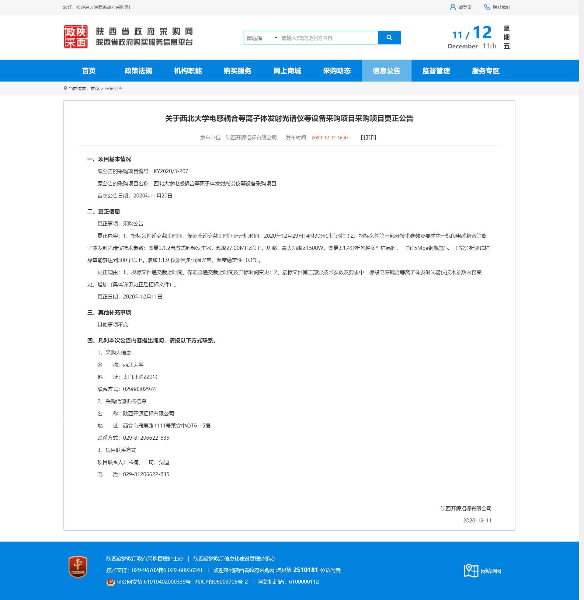 关于西北大学电感耦合等离子体发射光谱仪等设备采购项目采购项目更正公告 作者: 编辑:薛利娟 时间:2020-12-11 原公告地址:http://www.ccgp-shaanxi.gov.cn/notice/noticeDetail.do?noticeguid=8a85be3375d5d589017650e8e44672f0