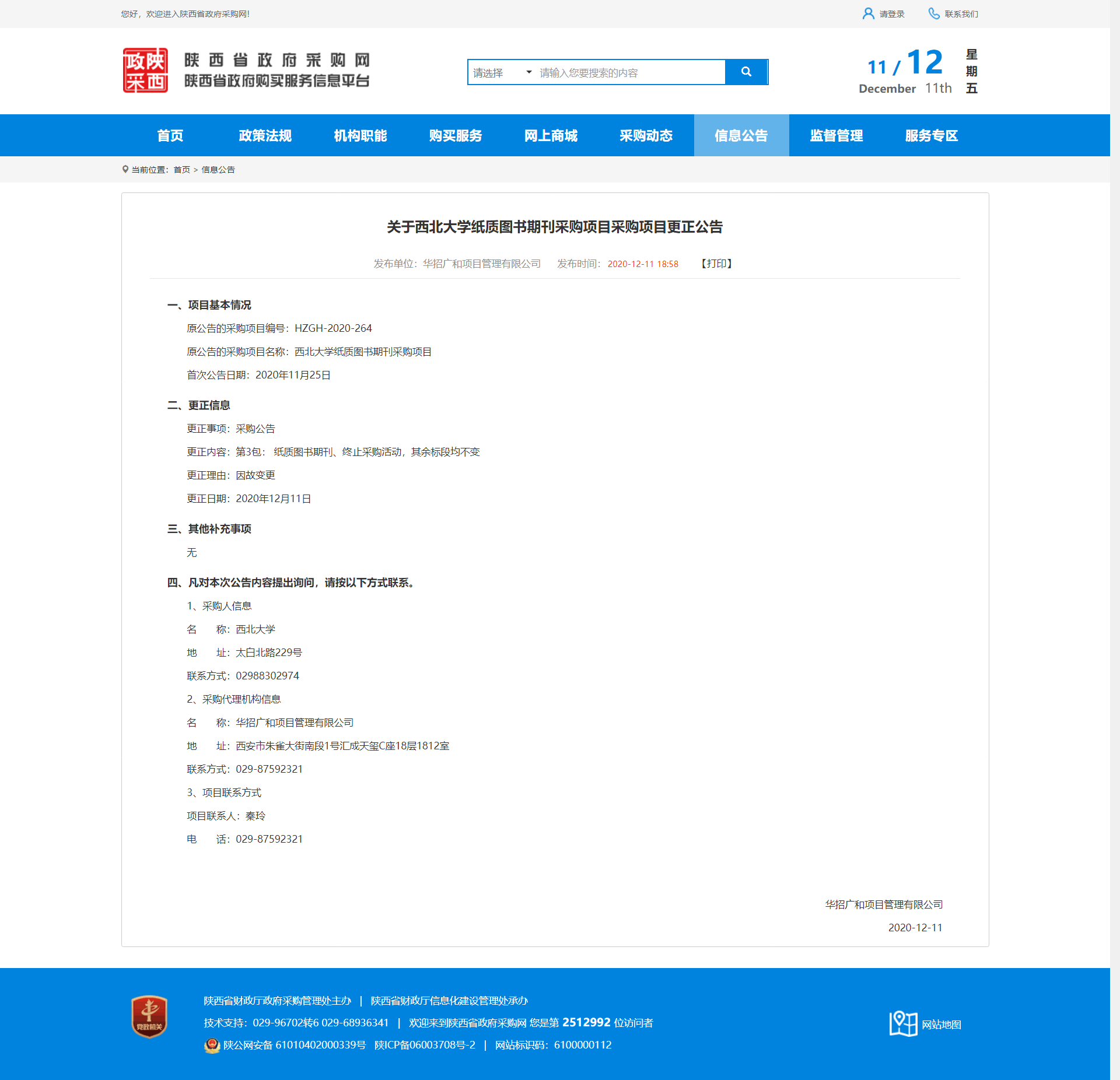 关于西北大学纸质图书期刊采购项目采购项目更正公告 作者: 编辑:薛利娟 时间:2020-12-11 原公告地址:http://www.ccgp-shaanxi.gov.cn/notice/noticeDetail.do?noticeguid=8a85be3475d5d52d017641b1340e7790