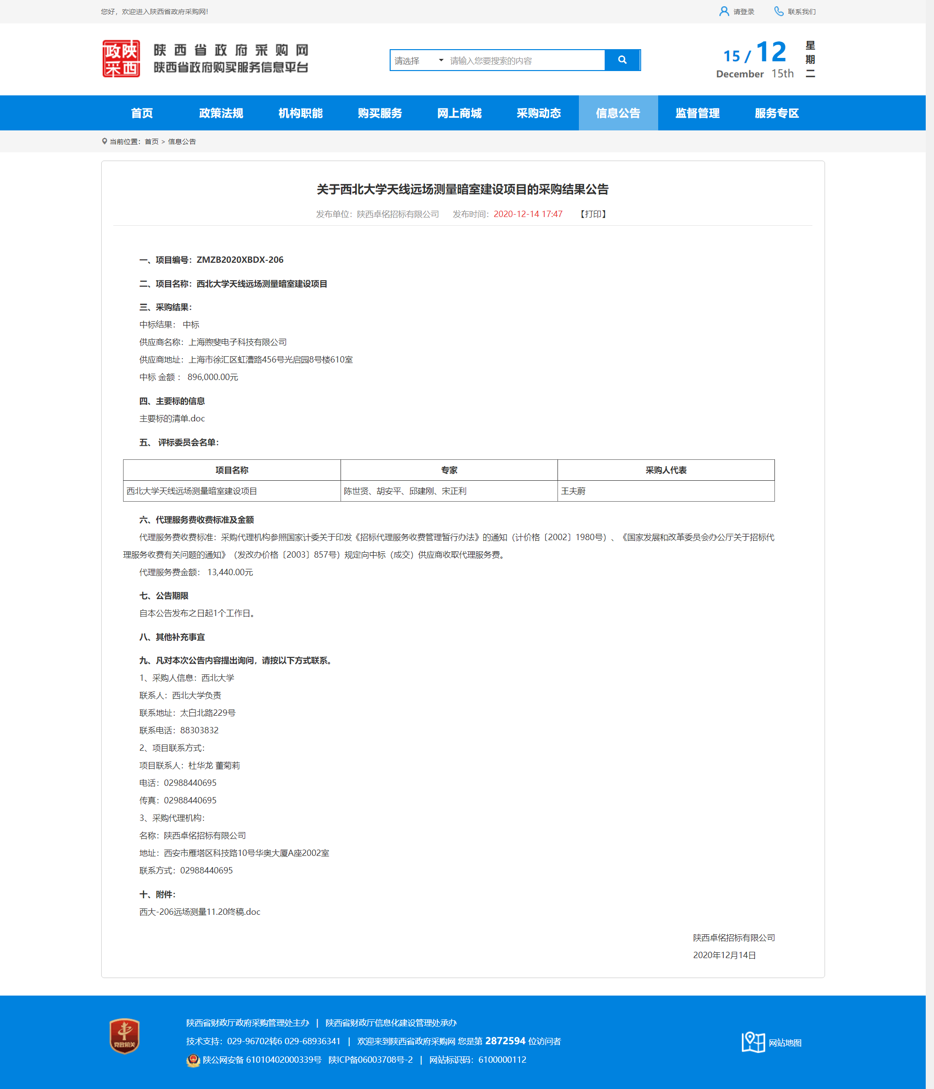 关于西北大学天线远场测量暗室建设项目的采购结果公告 作者: 编辑:薛利娟 时间:2020-12-15 原公告地址:http://www.ccgp-shaanxi.gov.cn/notice/noticeDetail.do?noticeguid=8a85be32765f9c9b017660a51c811cc2