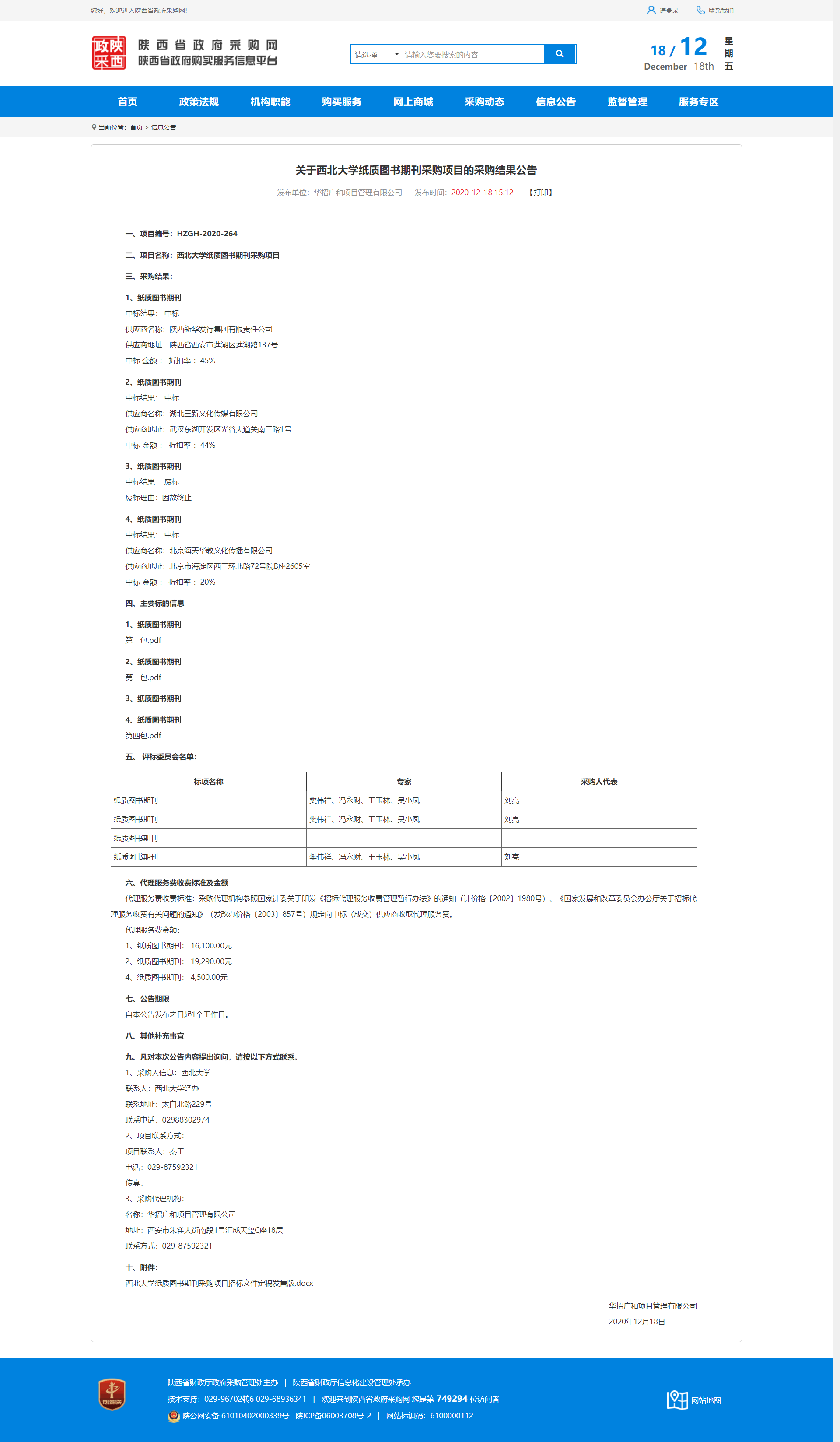 关于西北大学纸质图书期刊采购项目的采购结果公告 作者: 编辑:薛利娟 时间:2020-12-18 原公告地址:http://www.ccgp-shaanxi.gov.cn/notice/noticeDetail.do?noticeguid=8a85be32765f9c9b017674ac3d207427