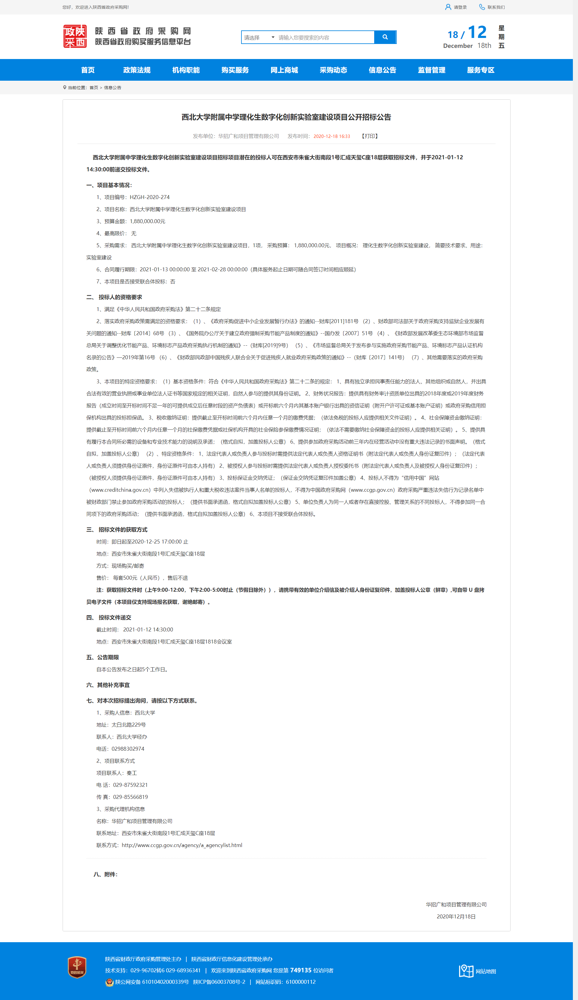 西北大学附属中学理化生数字化创新实验室建设项目公开招标公告 作者: 编辑:薛利娟 时间:2020-12-18 原公告地址:http://www.ccgp-shaanxi.gov.cn/notice/noticeDetail.do?noticeguid=8a85be32765f9c9b017674de4e727a0f