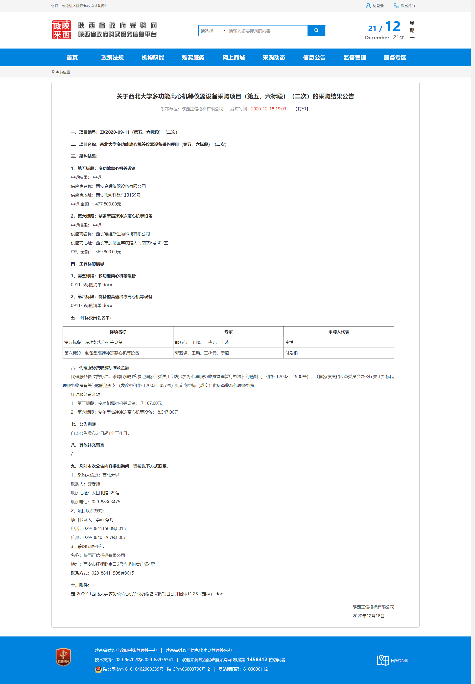 关于西北大学多功能离心机等仪器设备采购项目(第五、六标段)(二次)的采购结果公告 作者: 编辑:薛利娟 时间:2020-12-21 原 原公告地址:http://www.ccgp-shaanxi.gov.cn/notice/noticeDetail.do?noticeguid=8a85be34765f9eac01767583a6a72bec