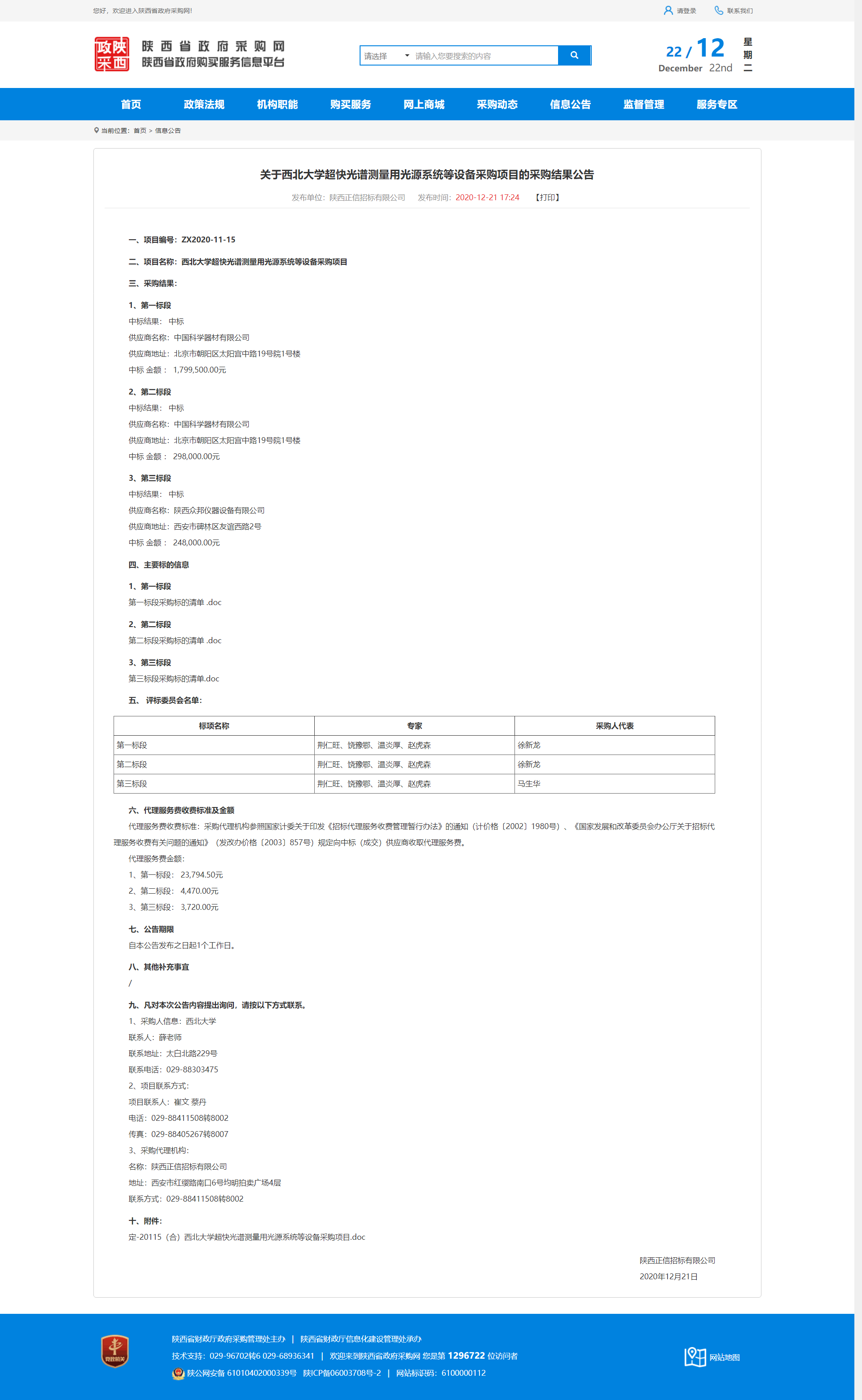 关于西北大学超快光谱测量用光源系统等设备采购项目的采购结果公告 作者: 编辑:薛利娟 时间:2020-12-22 原公告地址:http://www.ccgp-shaanxi.gov.cn/notice/noticeDetail.do?noticeguid=8a85be33765f9dd001768497df5d65ae