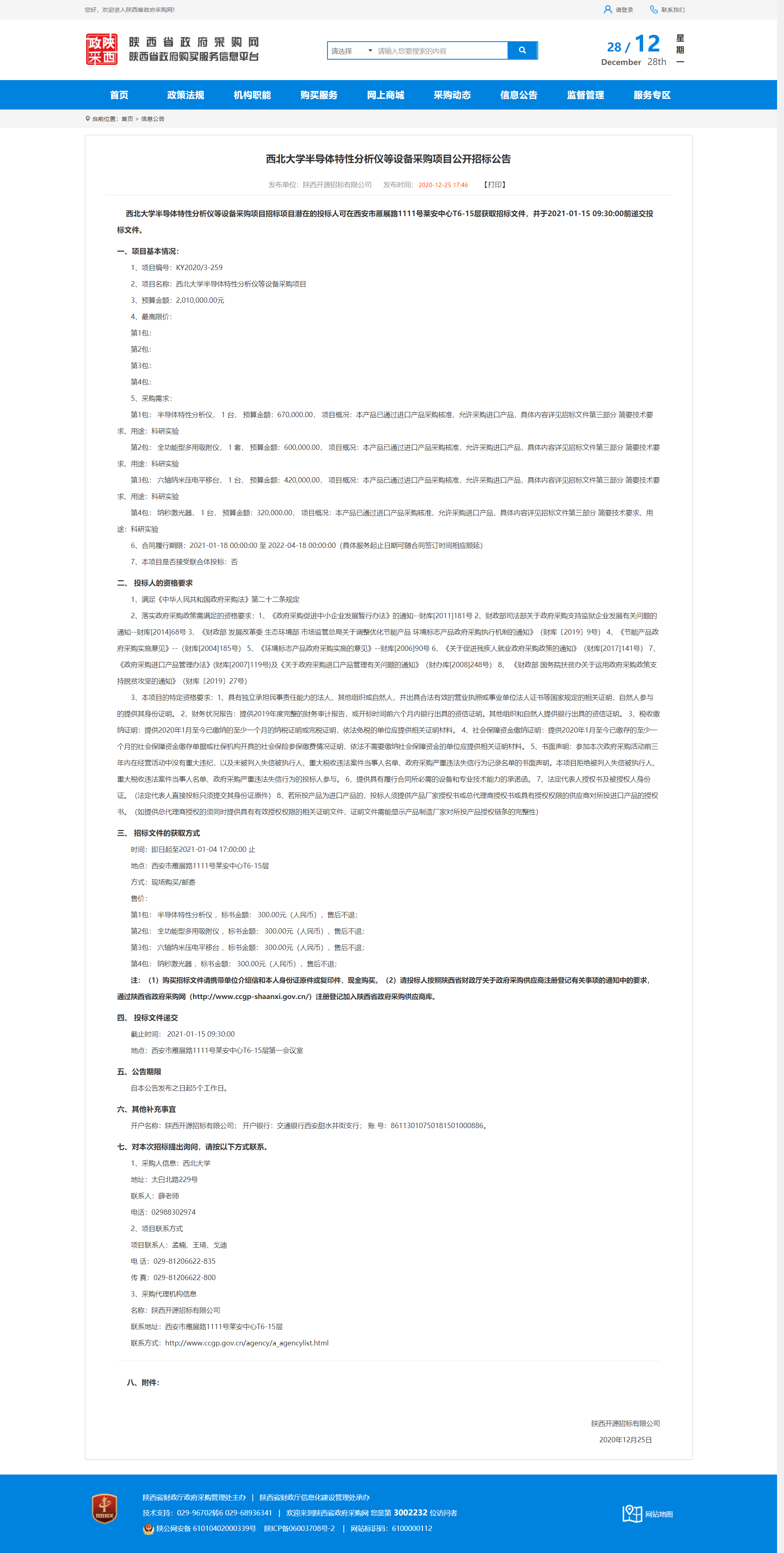 西北大学半导体特性分析仪等设备采购项目公开招标公告 作者: 编辑:薛利娟 时间:2020-12-28 原公告链接:http://www.ccgp-shaanxi.gov.cn/notice/noticeDetail.do?noticeguid=8a85be34769784fa0176994262042b99