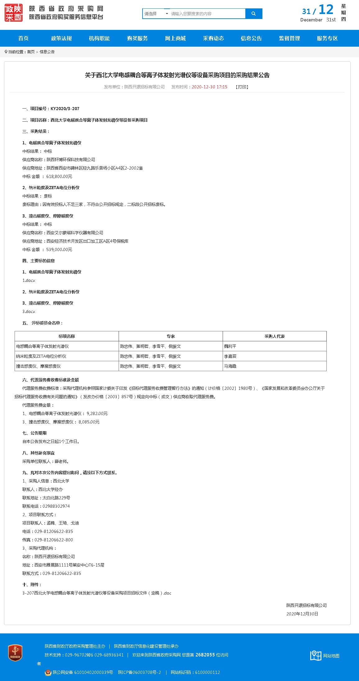 西北大学电感耦合等离子体发射光谱仪等设备采购项目的采购结果公告