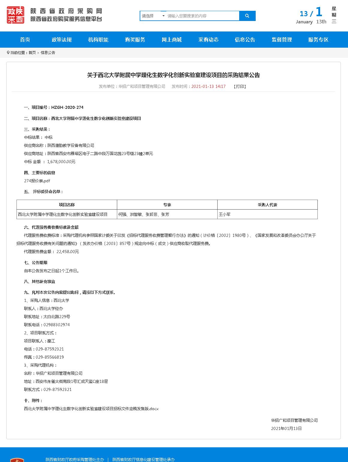 关于西北大学附属中学理化生数字化创新实验室建设项目的采购结果公告