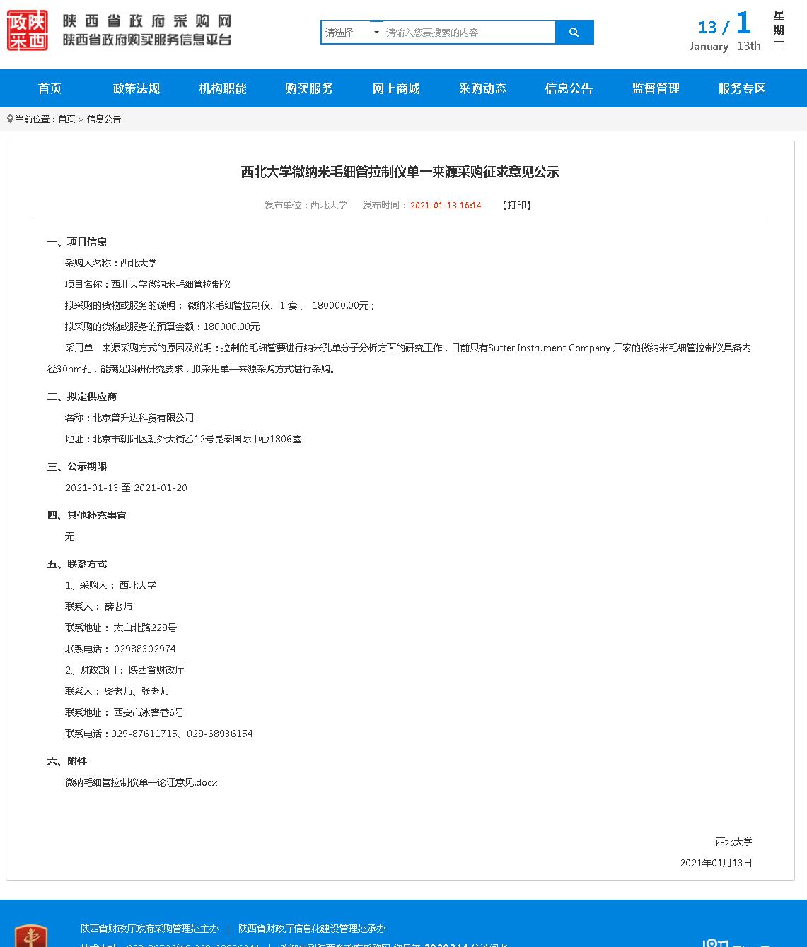 西北大学微纳米毛细管拉制仪单一来源采购征求意见公示