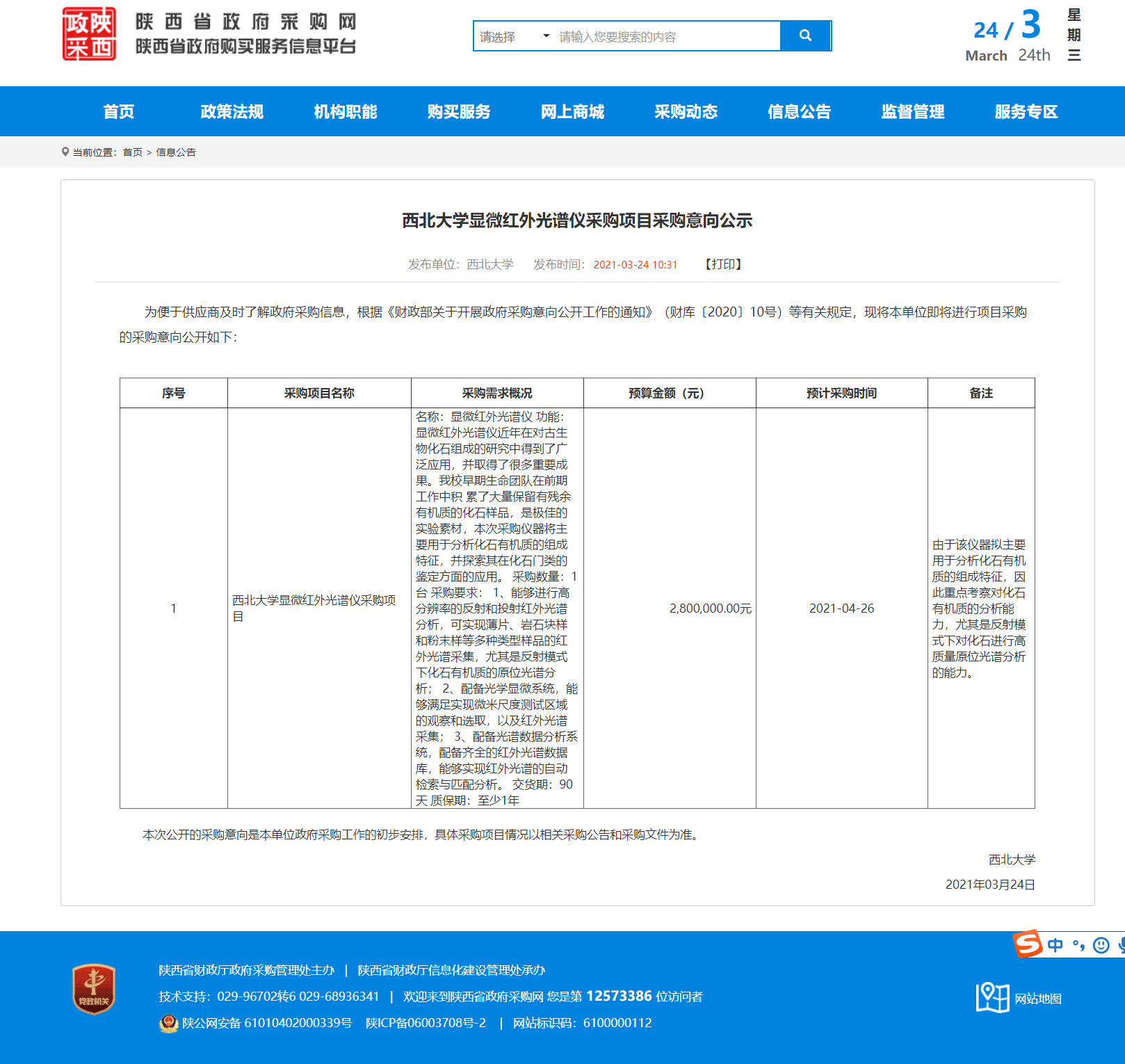 西北大学手持式矿石元素分析仪采购项目采购意向公示