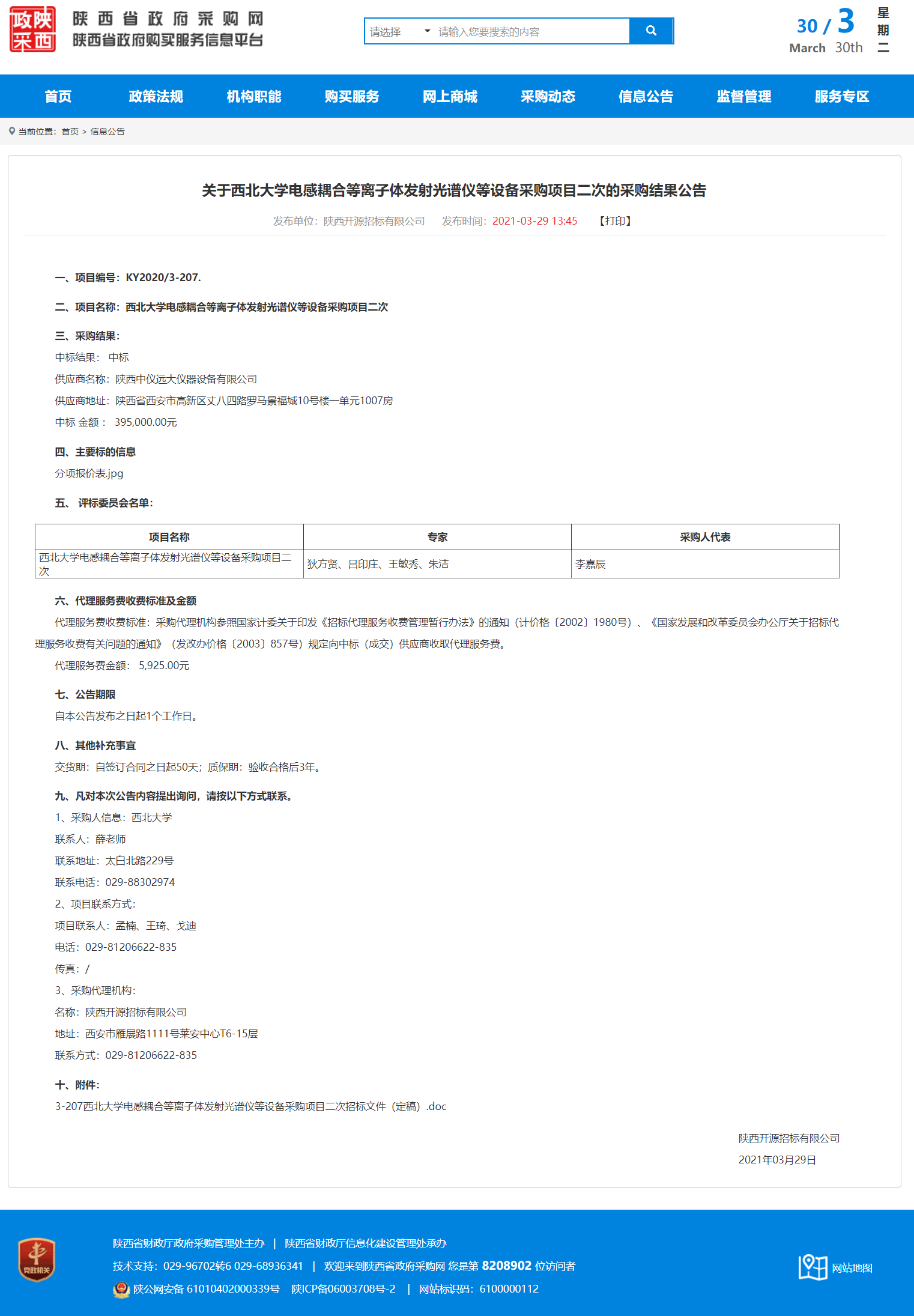 西北大学电感耦合等离子体发射光谱仪等设备采购项目二次的采购结果公告