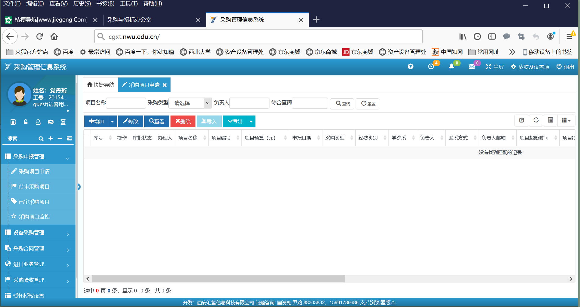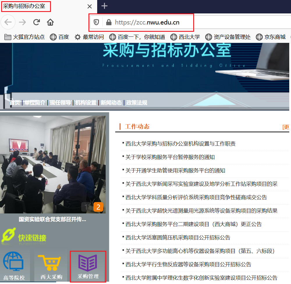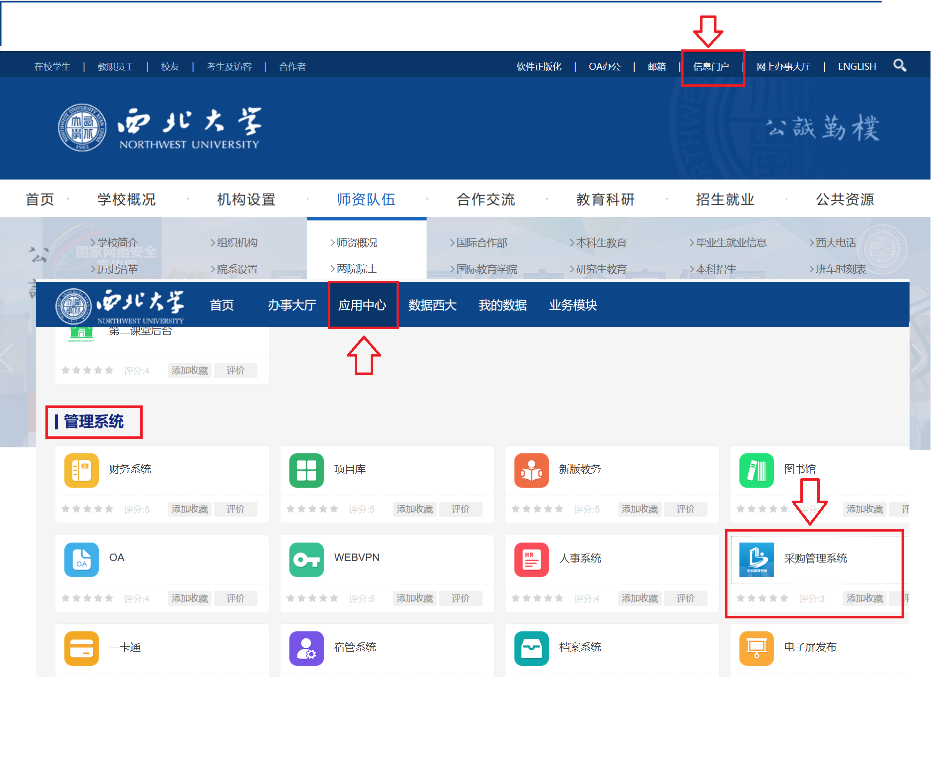 校内各单位可通过校园网首页右上角信息门户登陆后,选择应用中心-在管理系统栏目选择登录采购管理系统。或者通过西北大学采购与招标办公室网站首页“采购管理”登录,请使用谷歌、火狐或者微软浏览器登陆。