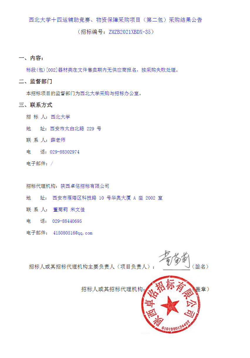 西北大学十四运辅助竞赛、物资保障采购项目(第一包)中标结果公告