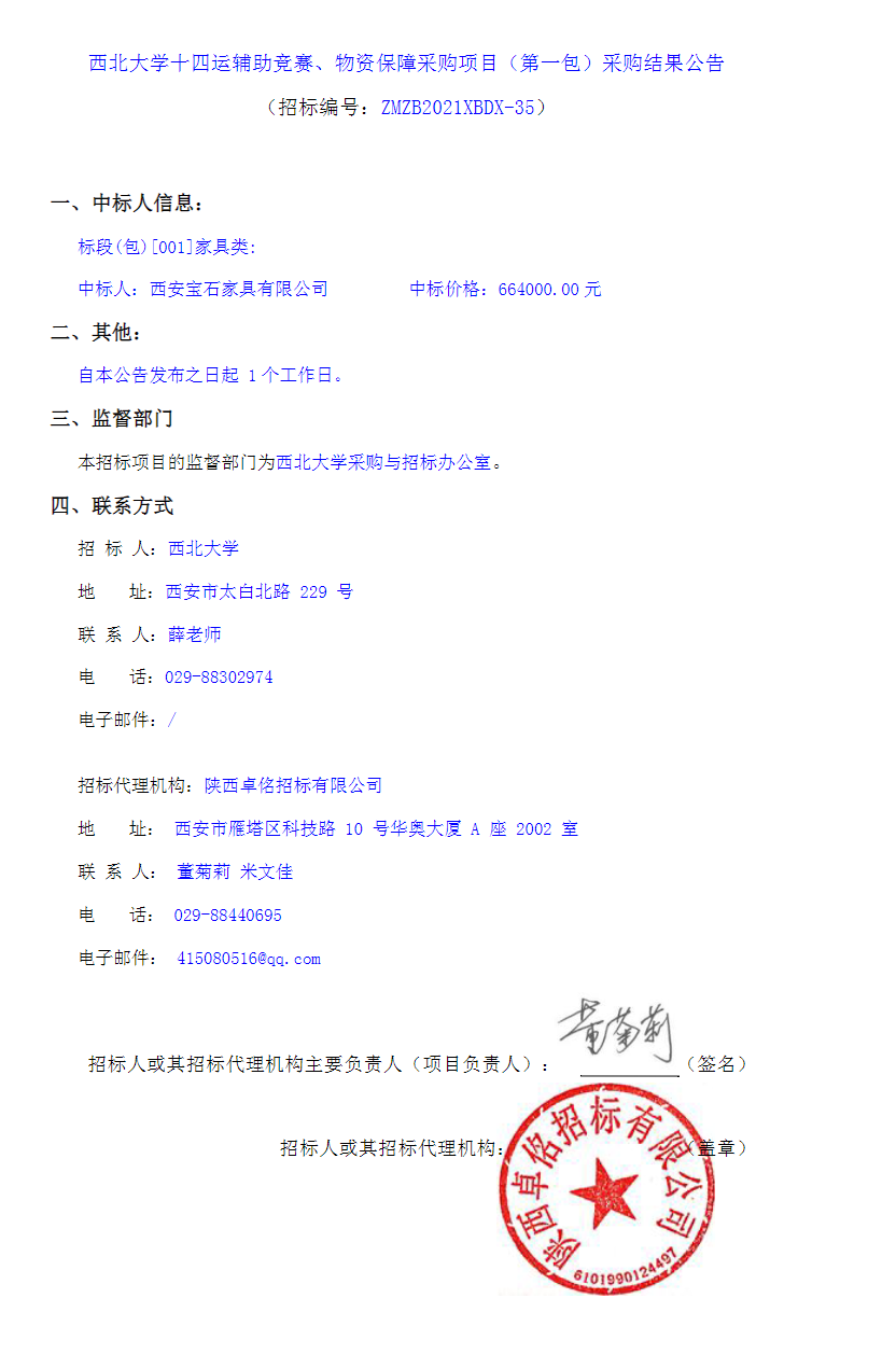 西北大学十四运辅助竞赛、物资保障采购项目(第一包)中标结果公告