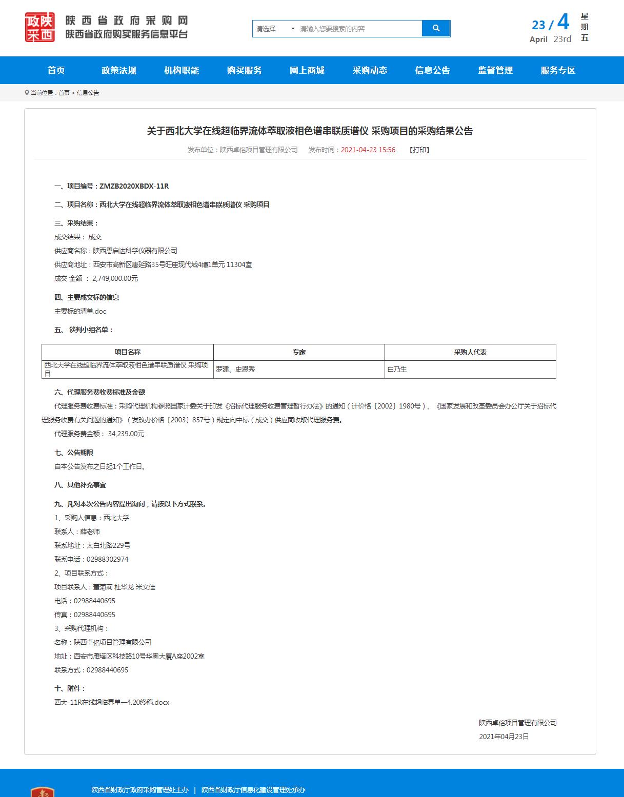 西北大学在线超临界流体萃取液相色谱串联质谱仪 采购项目的采购结果公告