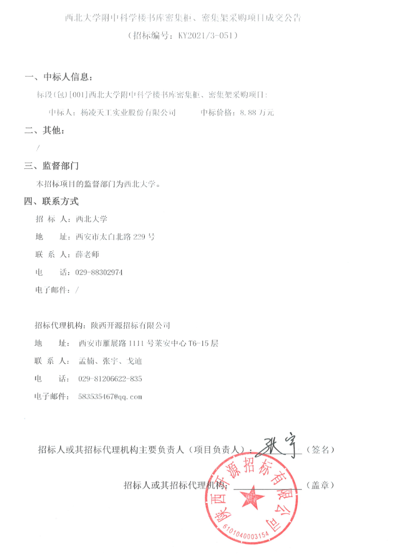 西北大学附中科学楼书库密集柜、密集架采购项目成交公告
