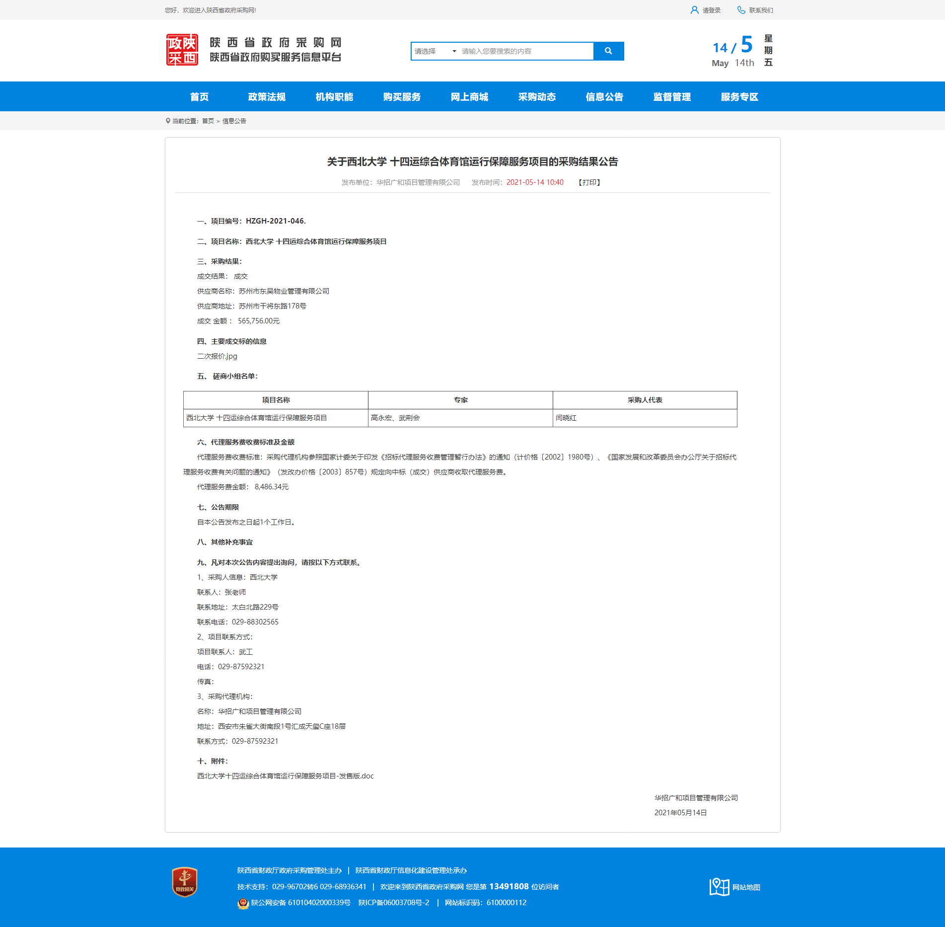 关于西北大学十四运综合体育馆运行保障服务项目的采购结果公告