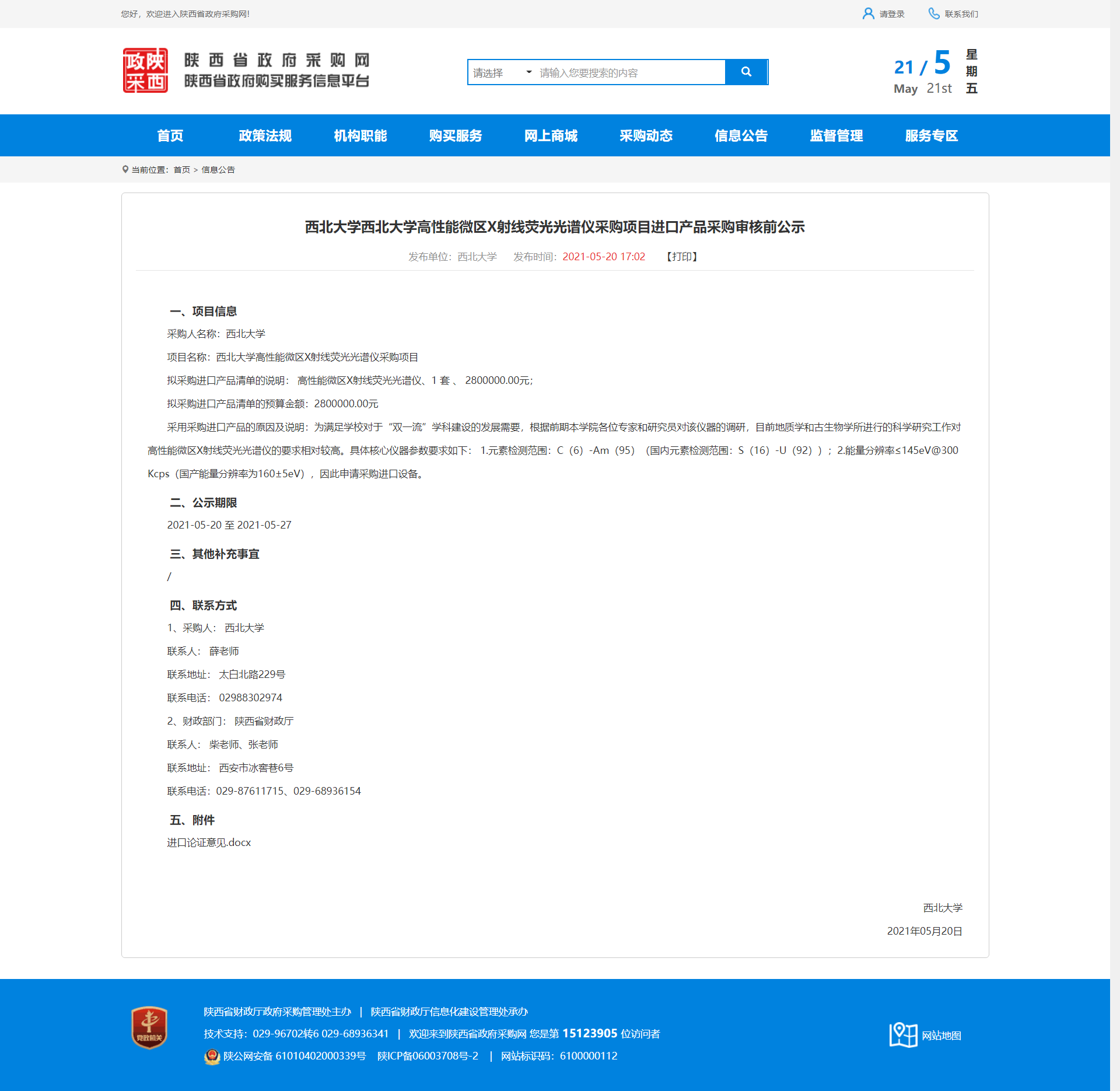 西北大学高性能微区X射线荧光光谱仪采购项目进口产品采购审核前公示 作者: 编辑:薛利娟 时间:2021-05-21 原公告地址:http://www.ccgp-shaanxi.gov.cn/notice/noticeDetail.do?noticeguid=8a85be33791baa0f017988f95b141335