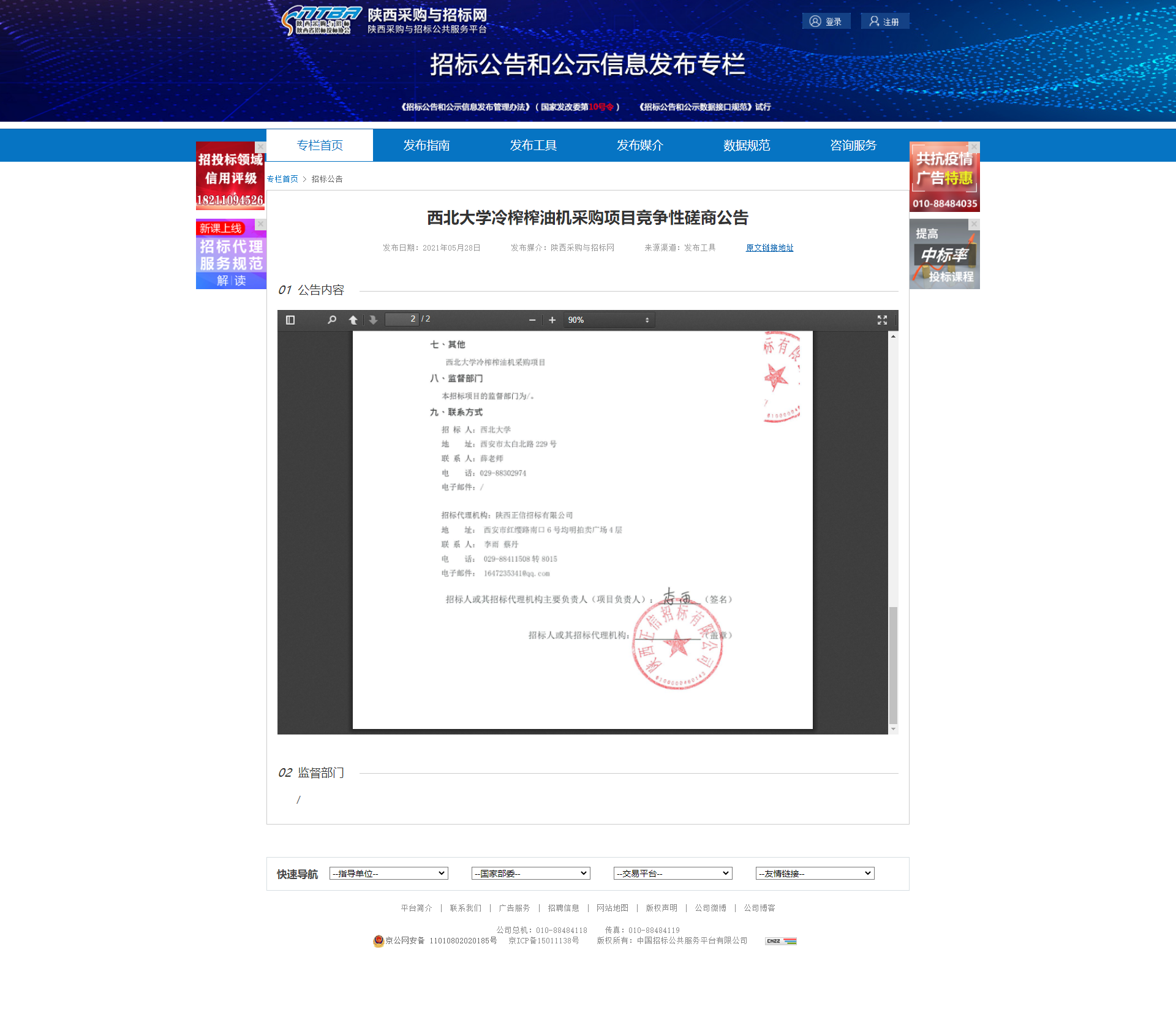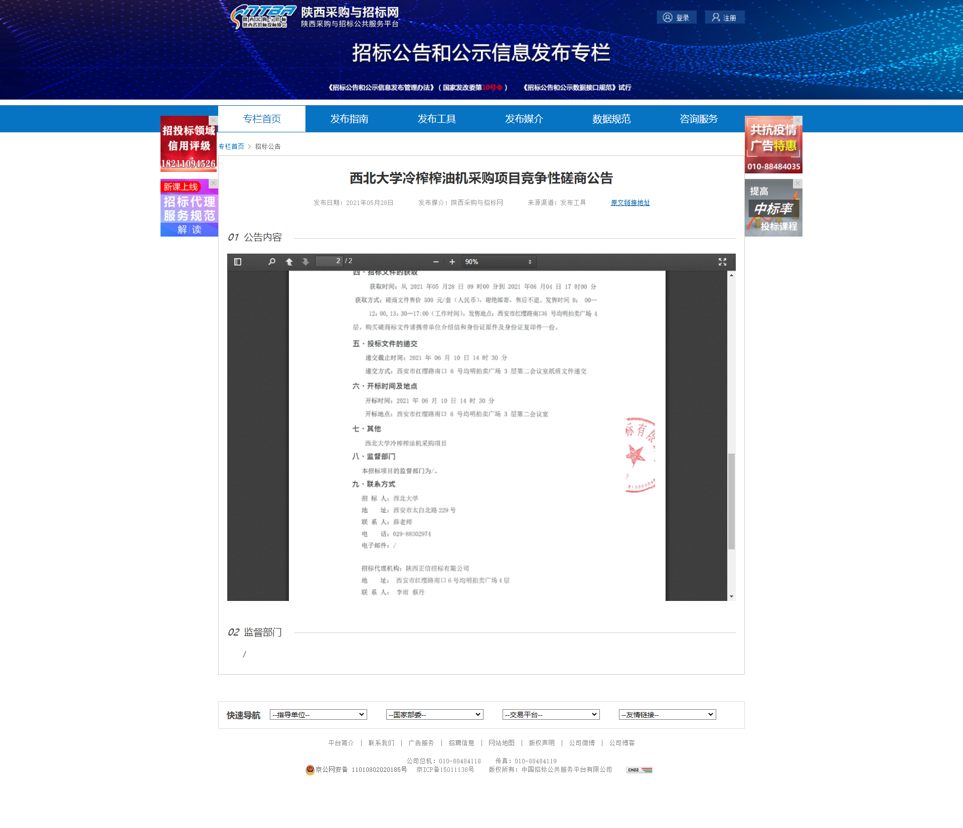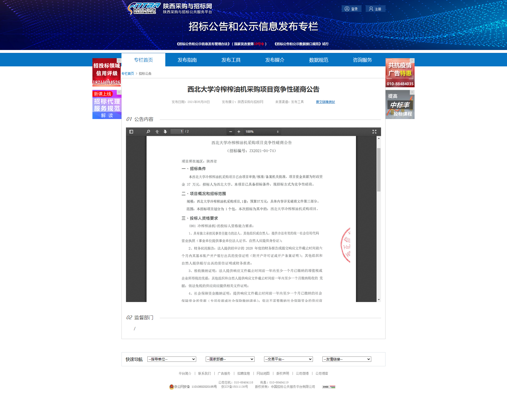 西北大学冷榨榨油机采购项目竞争性磋商公告 作者: 编辑:薛利娟 时间:2021-05-28 原公告地址:http://bulletin.sntba.com/biddingBulletin/2021-05-28/302428.html