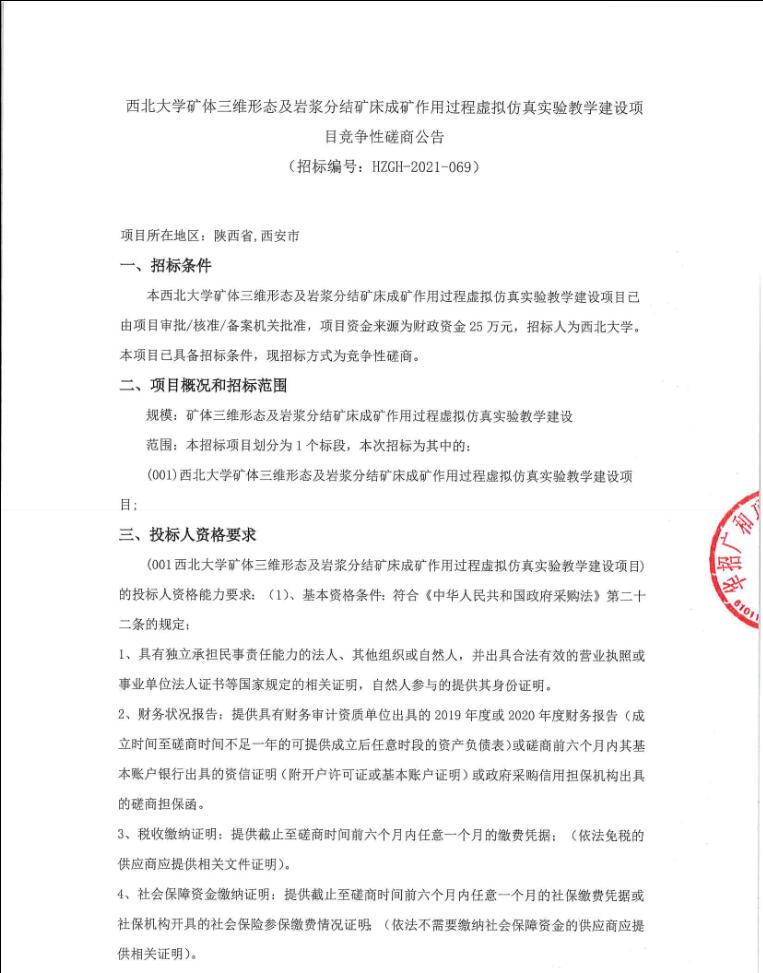 西北大学矿体三维形态及岩浆分结矿床成矿作用过程虚拟仿真实验教学建设项目竞争性磋商公告