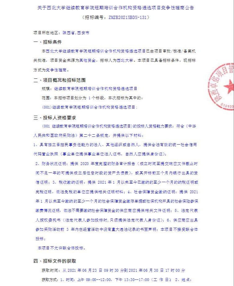 西北大学继续教育学院短期培训合作机构资格遴选项目竞争性磋商公告