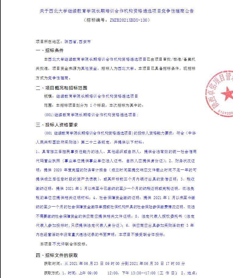 西北大学继续教育学院短期培训合作机构资格遴选项目竞争性磋商公告