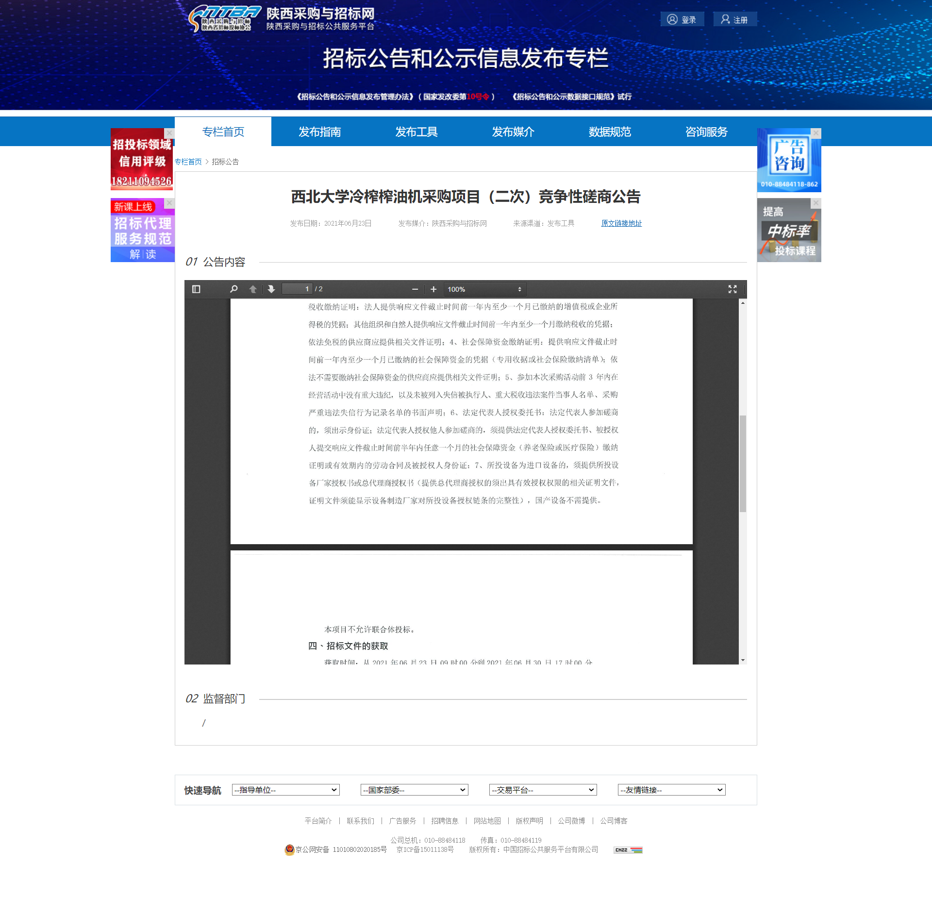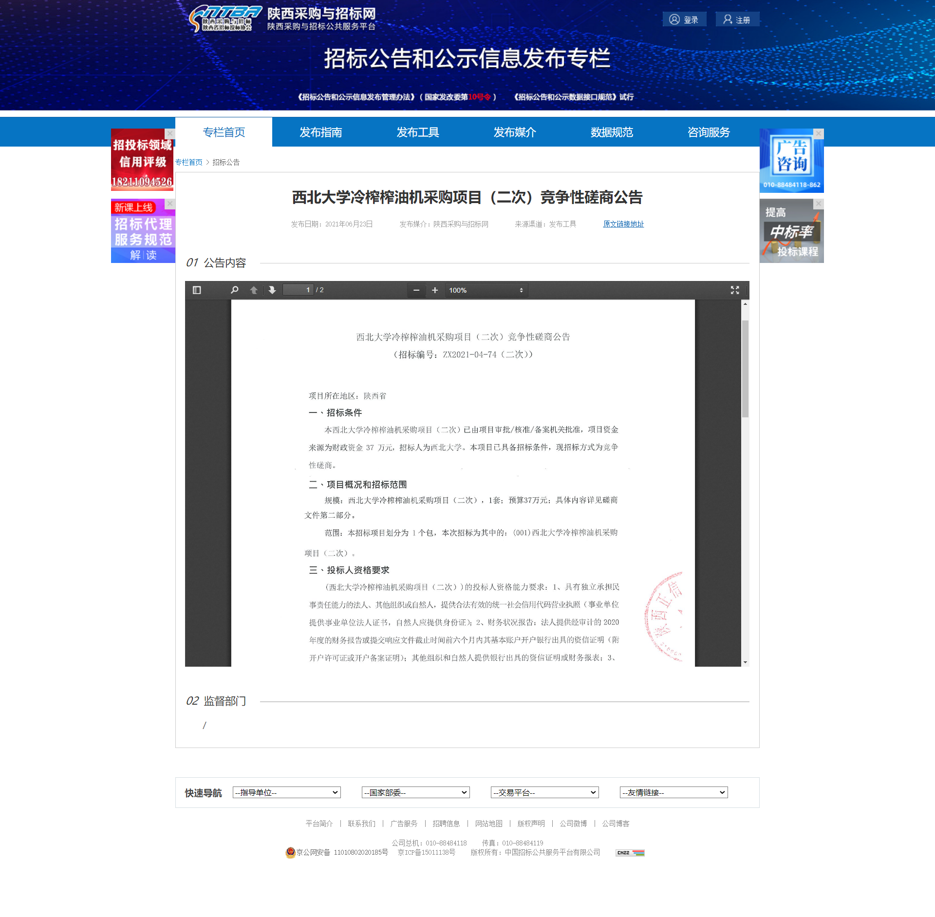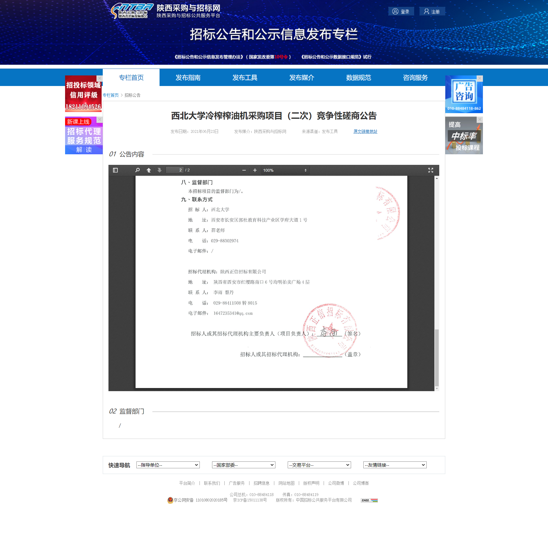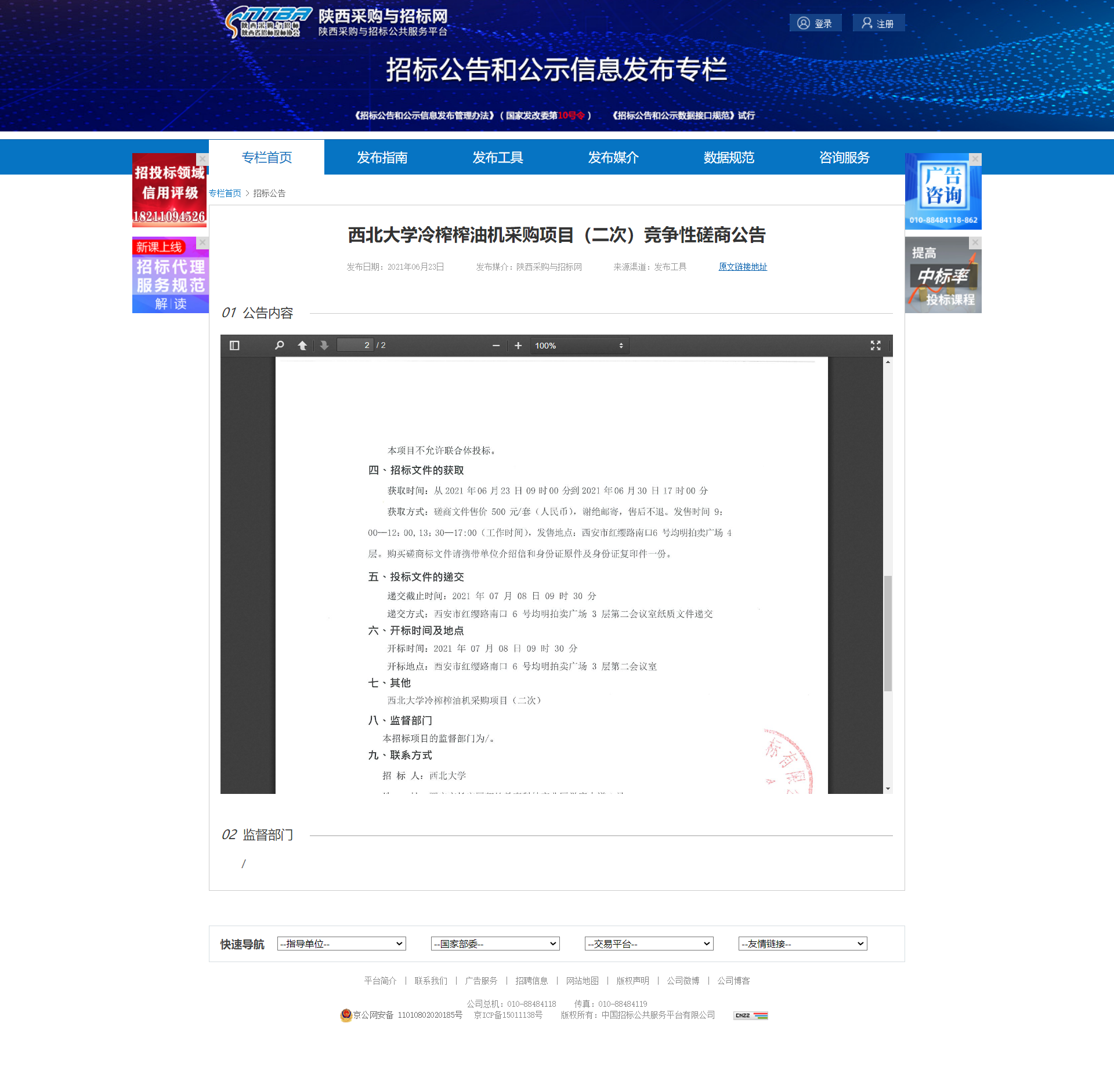 西北大学冷榨榨油机采购项目(二次)竞争性磋商公告 作者: 编辑:采购与招标办公室 时间:2021-06-24 原公告地址:http://bulletin.sntba.com/biddingBulletin/2021-06-23/311036.html
