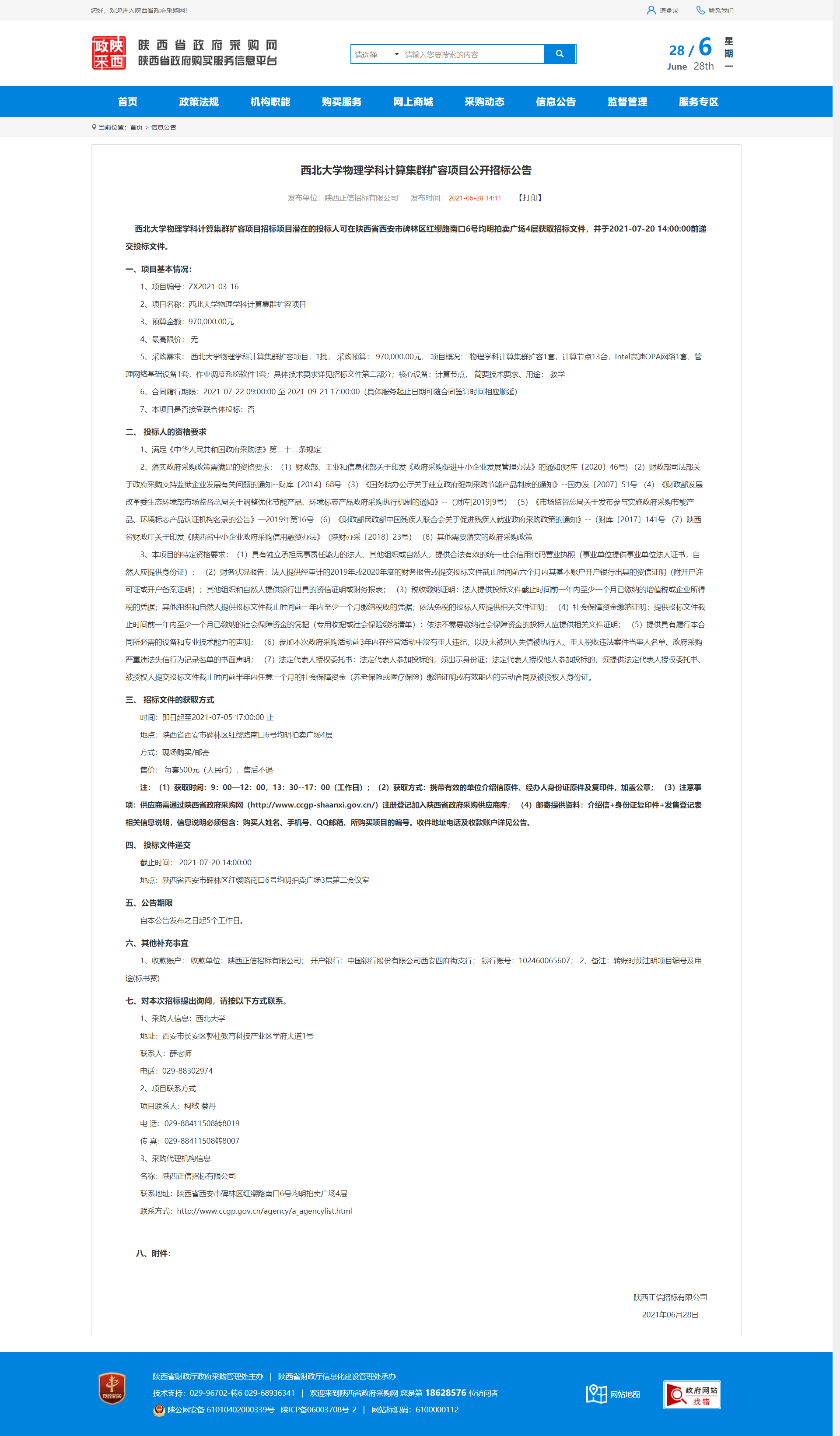 西北大学物理学科计算集群扩容项目公开招标公告 作者: 编辑:采购与招标办公室 时间:2021-06-28 原公告地址:http://www.ccgp-shaanxi.gov.cn/notice/noticeDetail.do?noticeguid=8a85be33791baa0f017a50f2f9203176