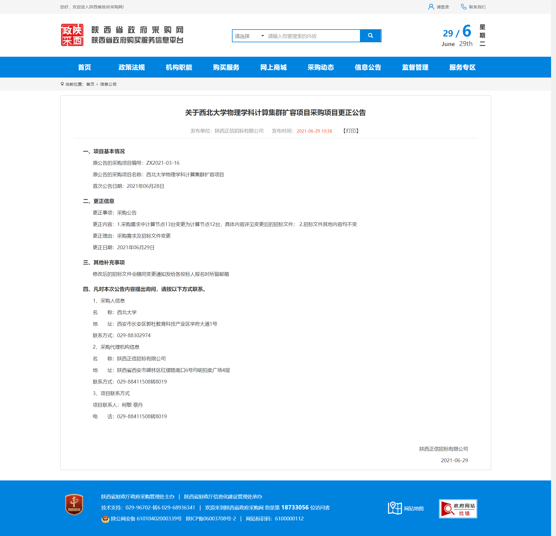 西北大学物理学科计算集群扩容项目采购项目更正公告 作者: 编辑:采购与招标办公室 时间:2021-06-29 原公告地址:http://www.ccgp-shaanxi.gov.cn/notice/noticeDetail.do?noticeguid=8a85be33791baa0f017a529f9f2b60b3