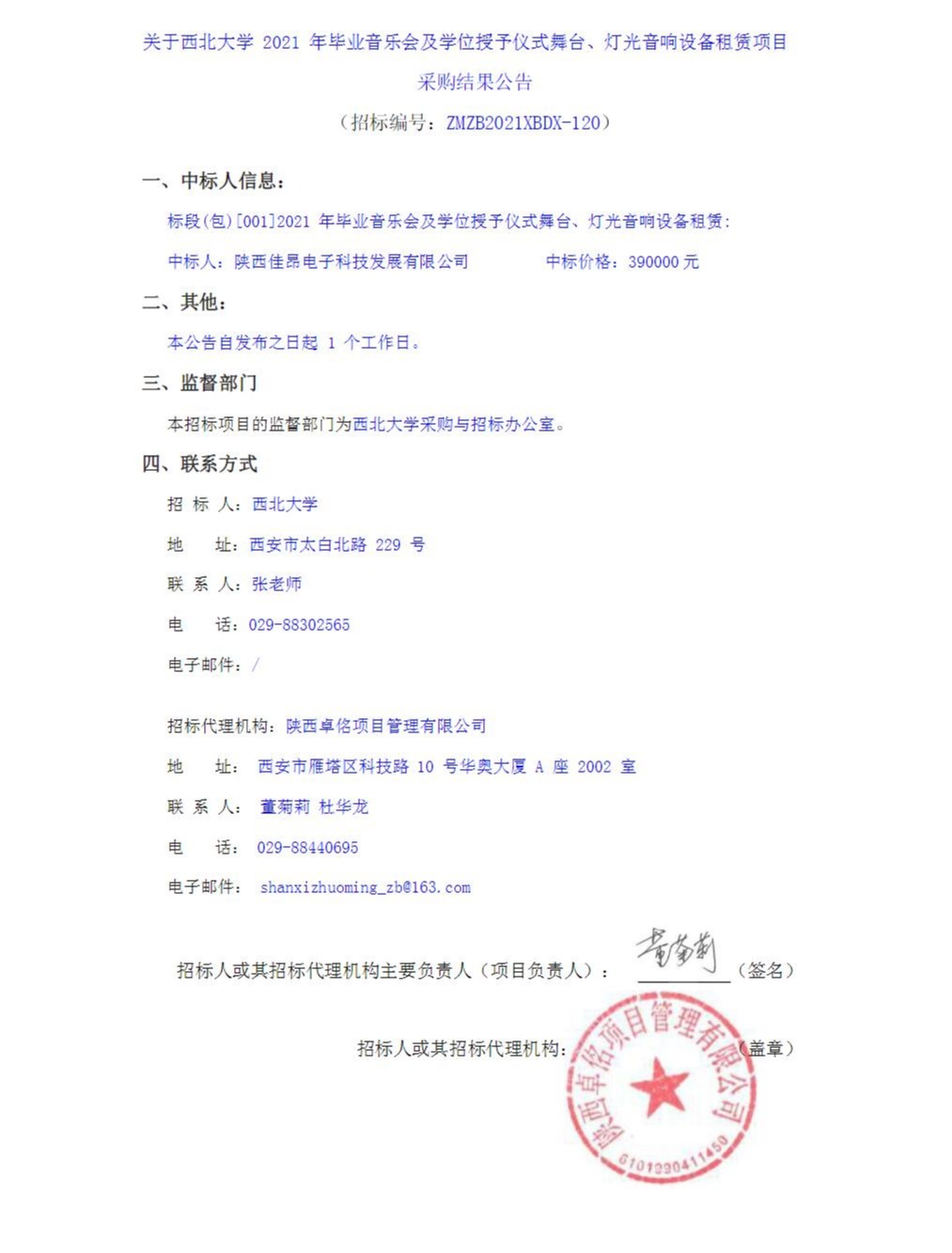 关于西北大学2021年毕业音乐会及学位授予仪式舞台、灯光音响设备租赁项目采购结果公告
