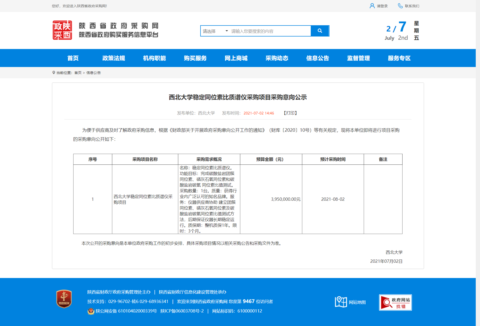 西北大学稳定同位素比质谱仪采购项目采购意向公示 作者: 编辑:采购与招标办公室 时间:2021-07-02 原公告地址:http://www.ccgp-shaanxi.gov.cn/notice/noticeDetail.do?noticeguid=8a85be317a51dcbc017a65e4a5e21daf