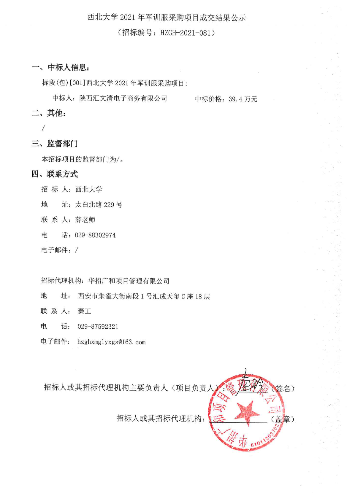 西北大学2021年军训服采购项目成交结果公示
