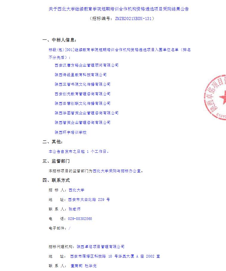 关于西北大学继续教育学院短期培训合作机构资格遴选项目采购结果公告