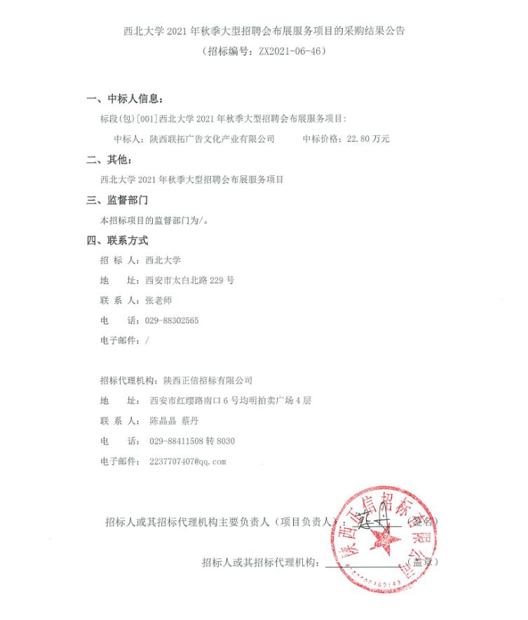 关于西北大学2021年秋季大型招聘会布展服务项目的采购结果公告