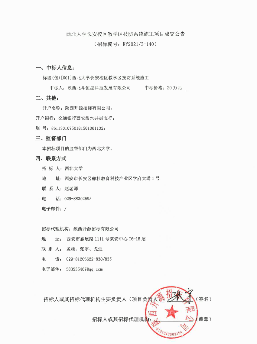 西北大学长安校区教学区技防系统施工项目成交公告