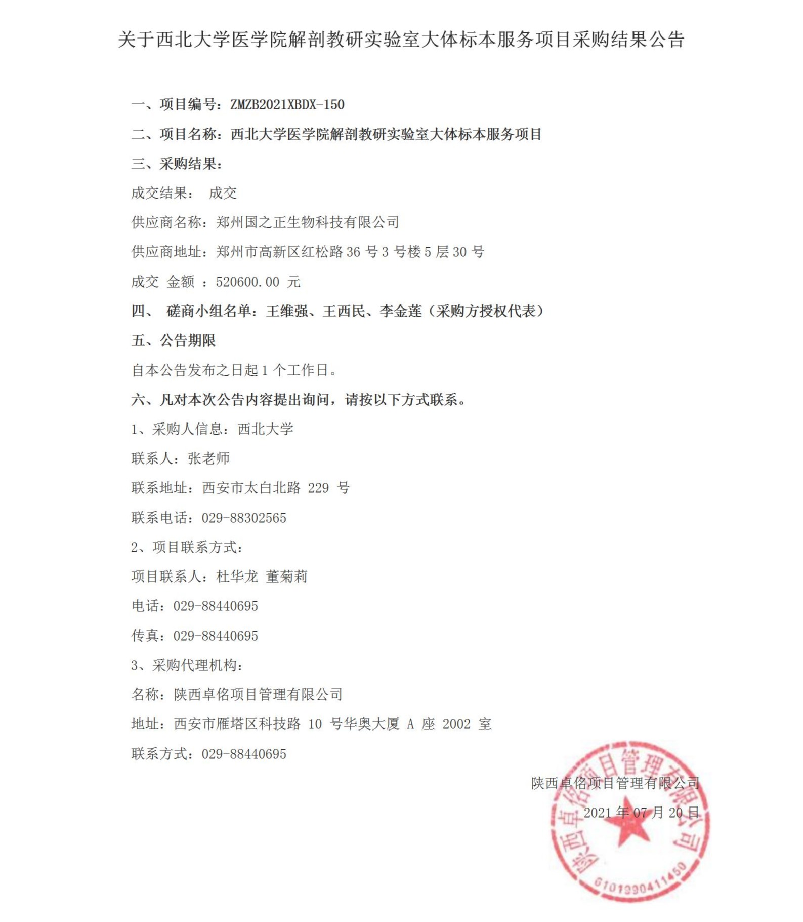 关于西北大学医学院解剖教研实验室大体标本服务项目采购结果公告