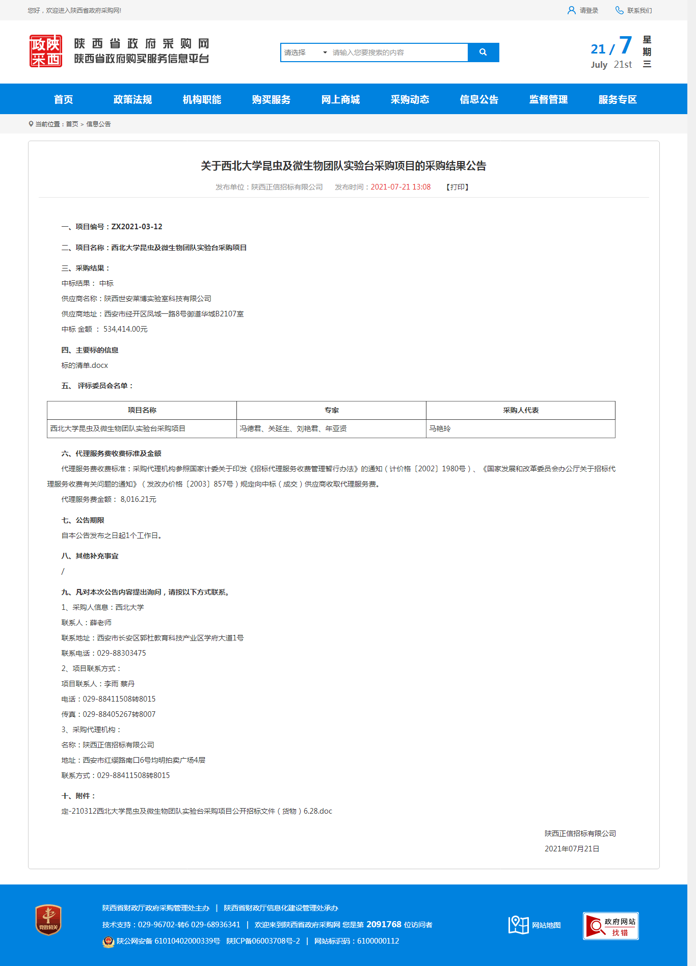 关于西北大学昆虫及微生物团队实验台采购项目的采购结果公告 作者: 编辑:采购与招标办公室 时间:2021-07-21 原公告地址:http://www.ccgp-shaanxi.gov.cn/notice/noticeDetail.do?noticeguid=8a85be347a795e58017ac68e08ff1739