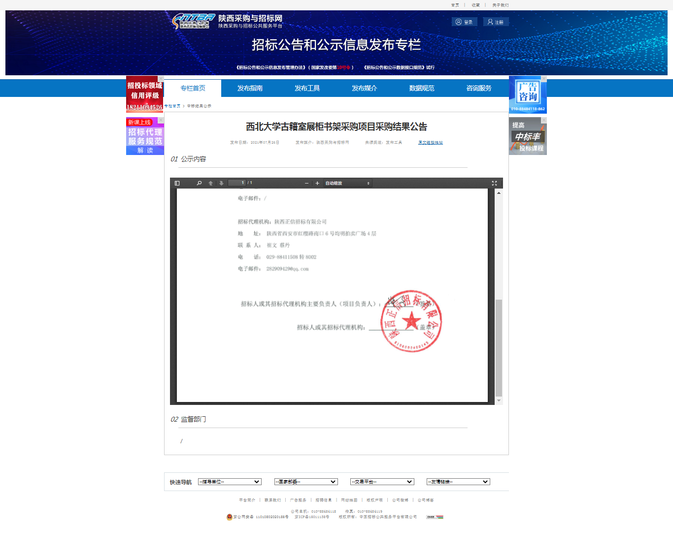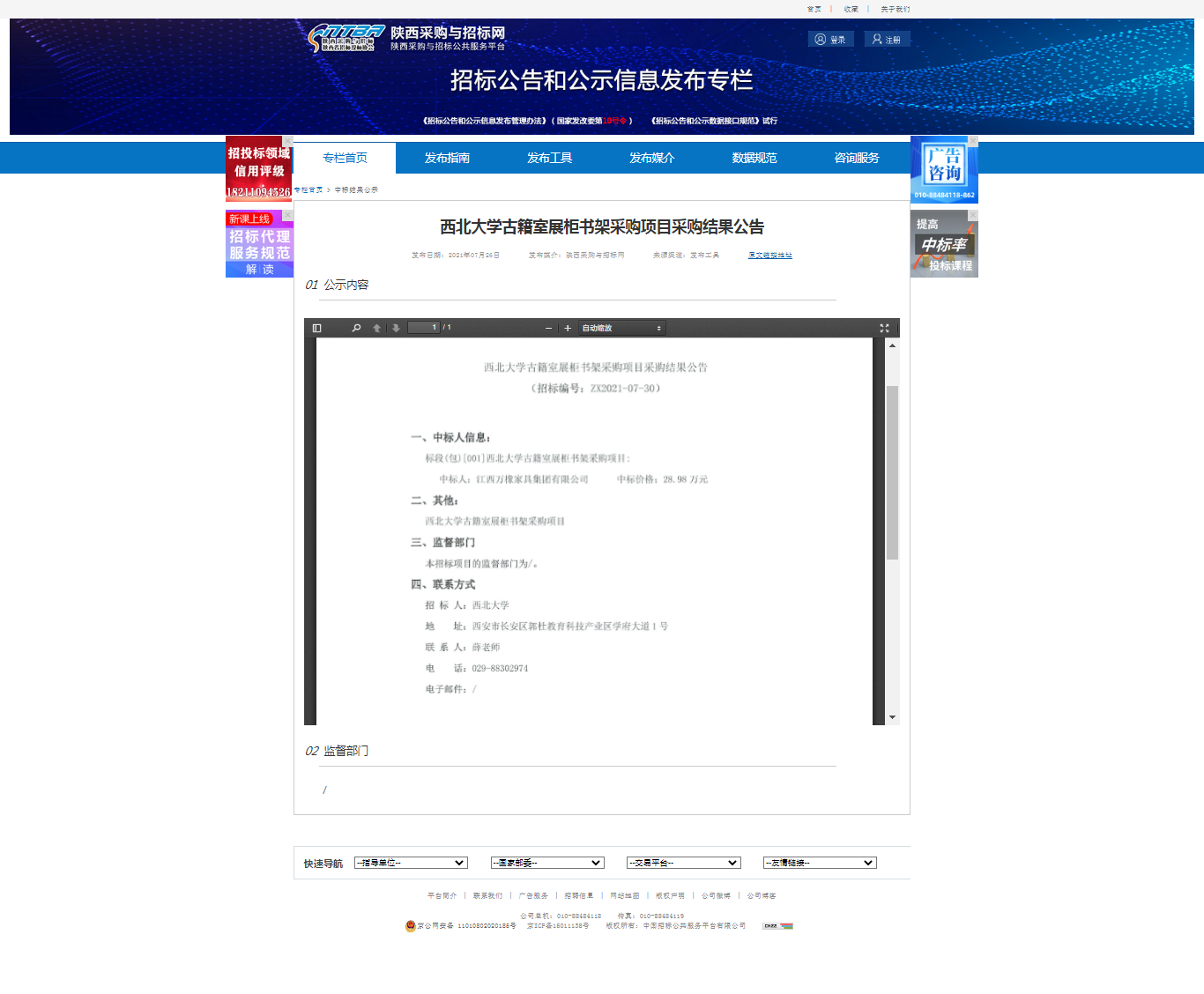 西北大学古籍室展柜书架采购项目采购结果公告 作者: 编辑:采购与招标办公实验室 时间:2021-07-26 原公告地址:http://bulletin.sntba.com/resultBulletin/2021-07-26/323299.html