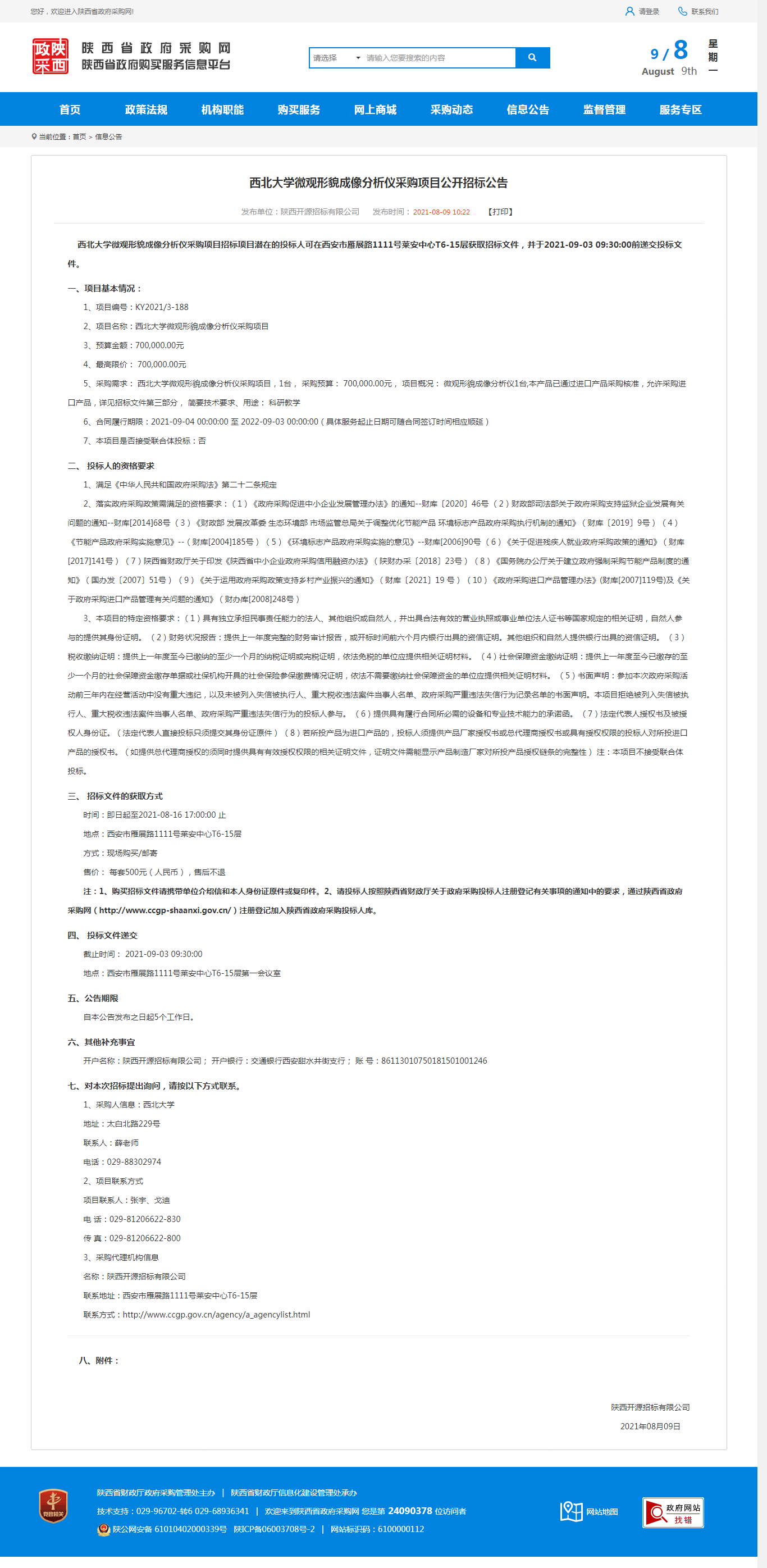 西北大学微观形貌成像分析仪采购项目公开招标公告 作者: 编辑:采购与招标办公室 时间:2021-08-09 原公告地址:http://www.ccgp-shaanxi.gov.cn/notice/noticeDetail.do?noticeguid=8a85be347b04610d017b2881fd8505e0