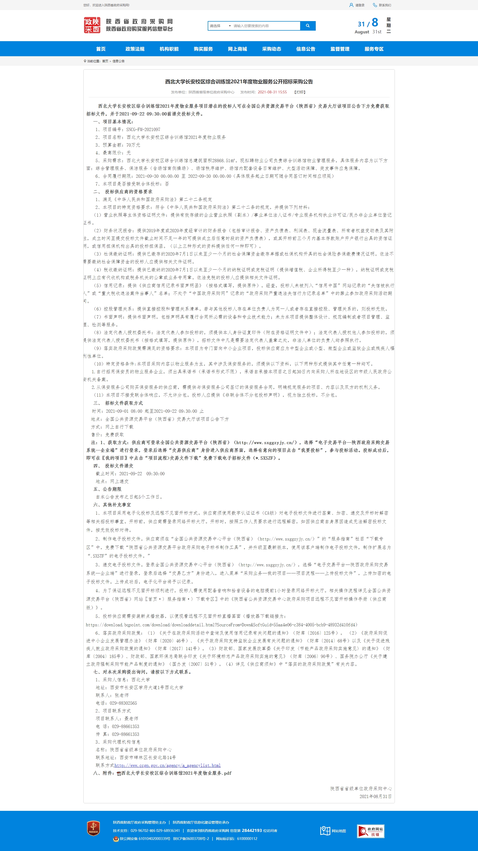 西北大学长安校区综合训练馆2021年度物业服务公开招标采购公告