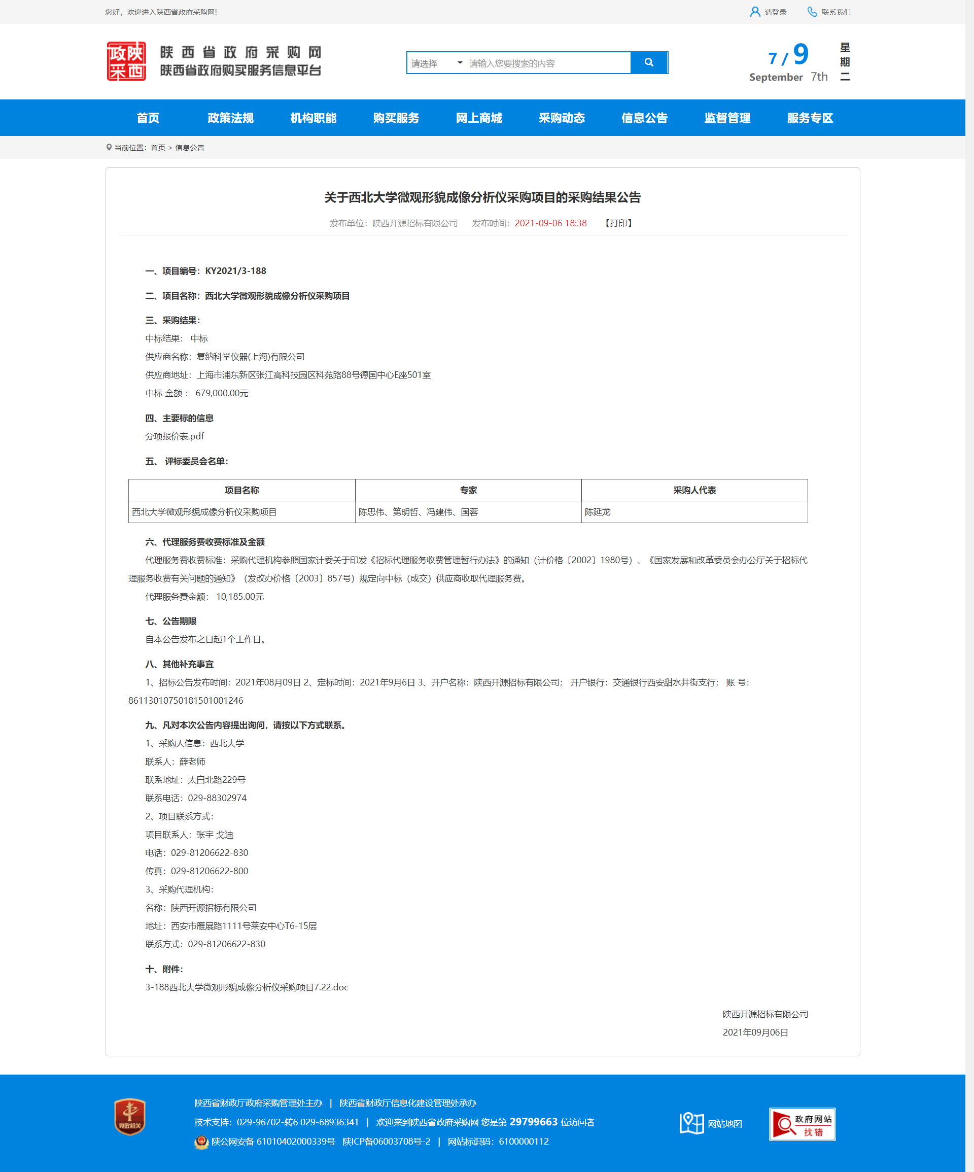 关于西北大学微观形貌成像分析仪采购项目的采购结果公告 作者: 编辑:采购与招标办公室 时间:2021-09-07 原公告地址:http://www.ccgp-shaanxi.gov.cn/notice/noticeDetail.do?noticeguid=8a85be347b04610d017bbaac92114f2e