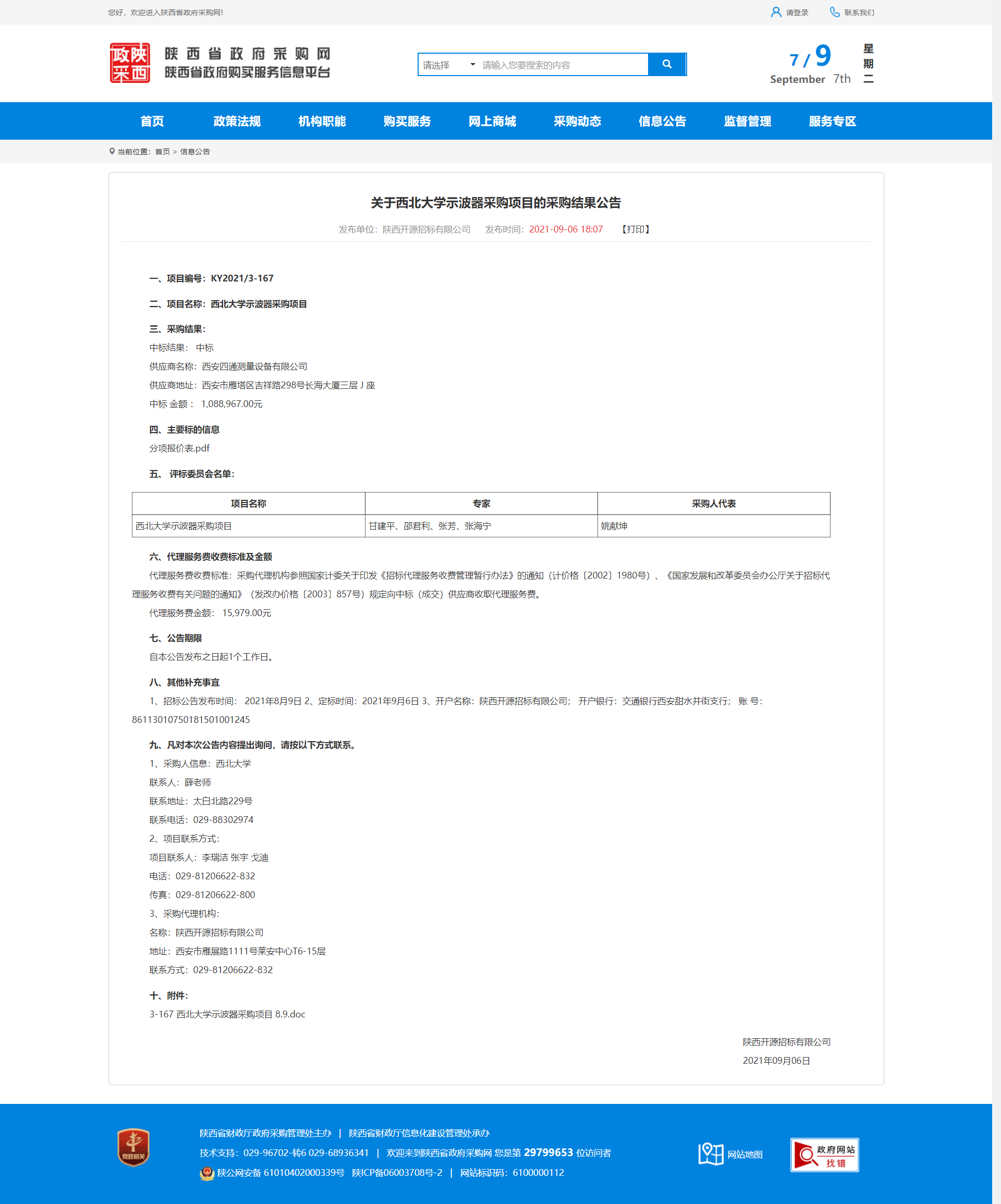 关于西北大学示波器采购项目的采购结果公告 作者: 编辑:采购与招标办公室 时间:2021-09-07 原公告地址:http://www.ccgp-shaanxi.gov.cn/notice/noticeDetail.do?noticeguid=8a85be347b04610d017bba92520e4e63