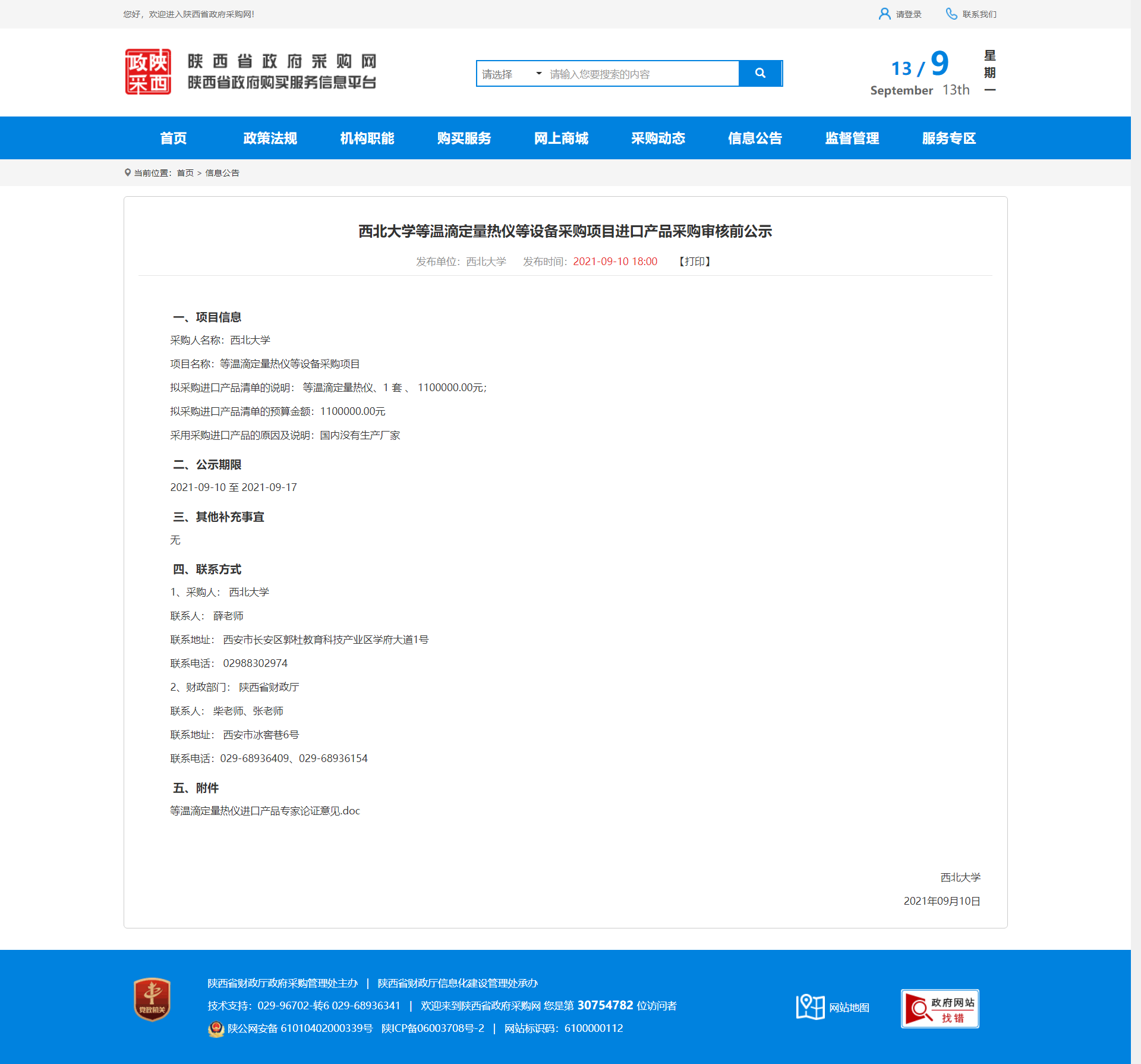 西北大学等温滴定量热仪等设备采购项目进口产品采购审核前公示 作者: 编辑:采购与招标办公室 时间:2021-09-13 原公告地址:http://www.ccgp-shaanxi.gov.cn/notice/noticeDetail.do?noticeguid=8a85be347bc00296017bcf17c5ca1019