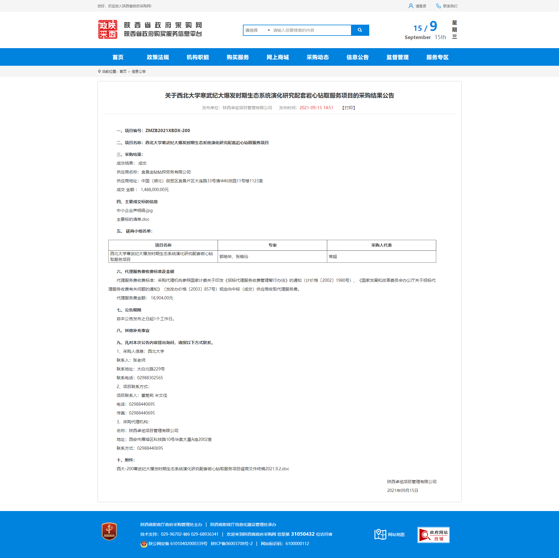 关于西北大学寒武纪大爆发时期生态系统演化研究配套岩心钻取服务项目的采购结果公告