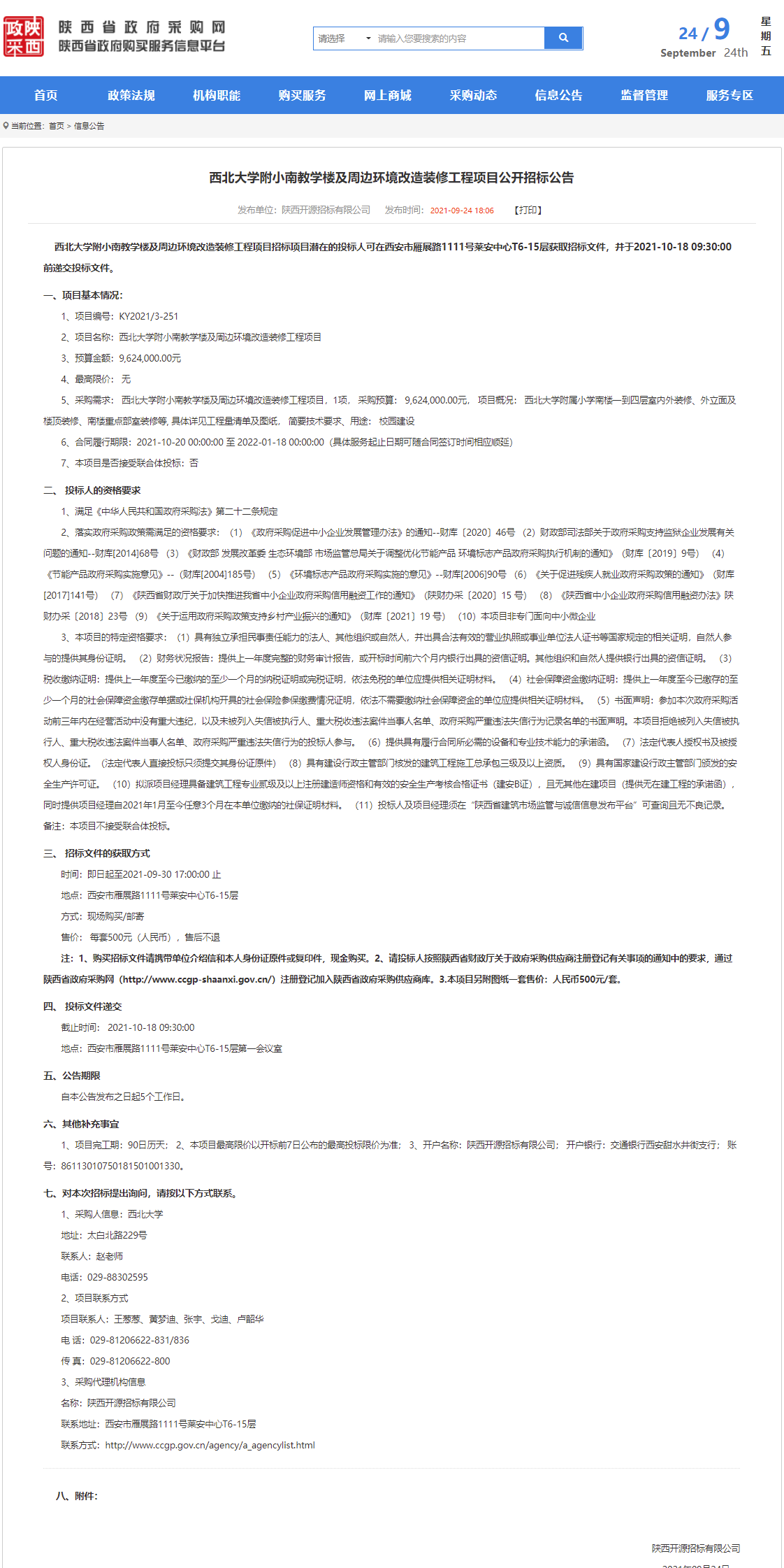 西北大学附小南教学楼及周边环境改造装修工程项目公开招标公告